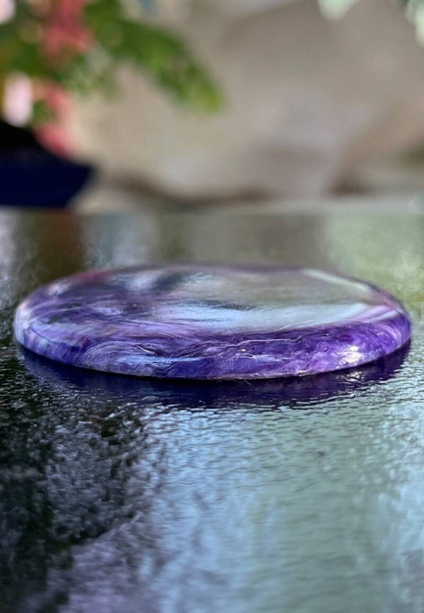Charoiet edelsteen cabochon rond met vlakke achterkant, groot