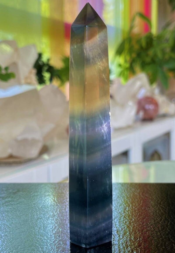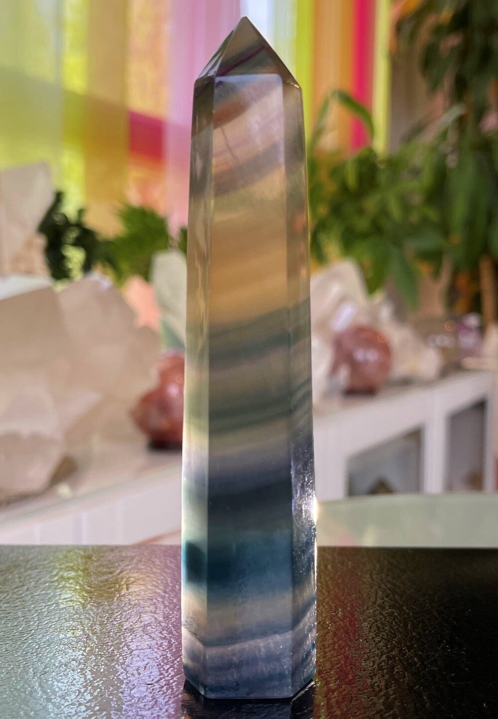 Regenboog Fluoriet geslepen punt of obelisk met 6 vlakken, ook Multicolour Fluoriet genoemd, medium