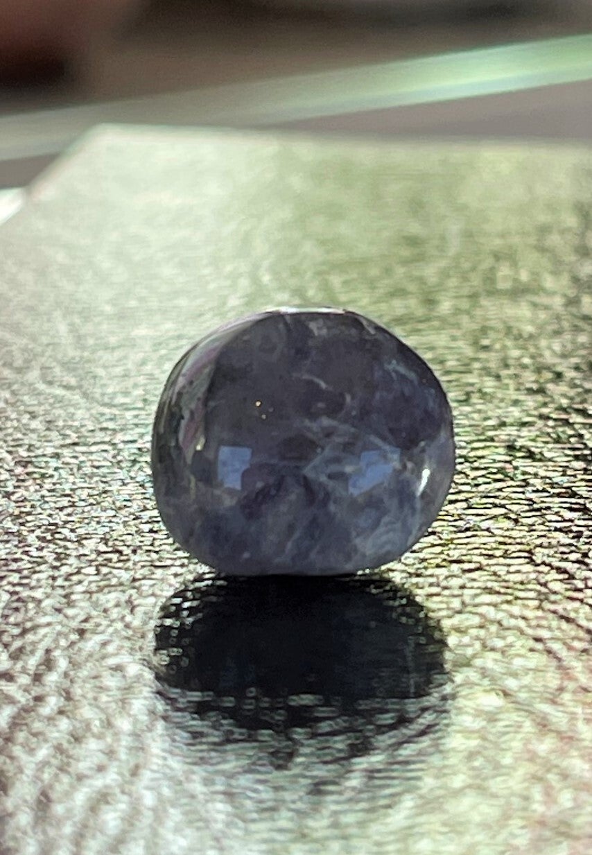 Ioliet getrommeld, tegen het licht gehouden is het een transparante steen, klein