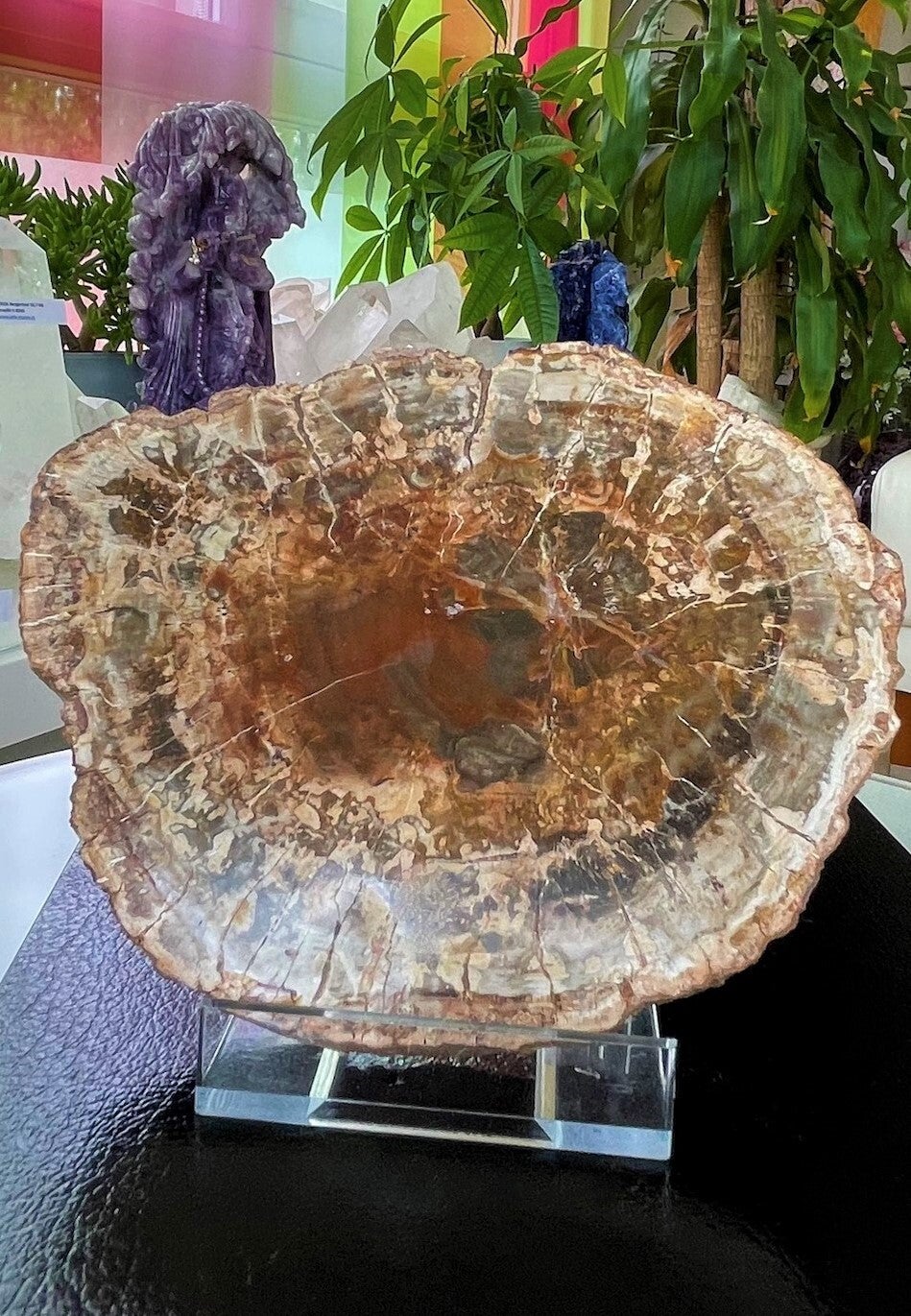 Mooi stuk Versteend Hout platte schijf, aan twee zijden gepolijst met ruwe buitenrand, medium