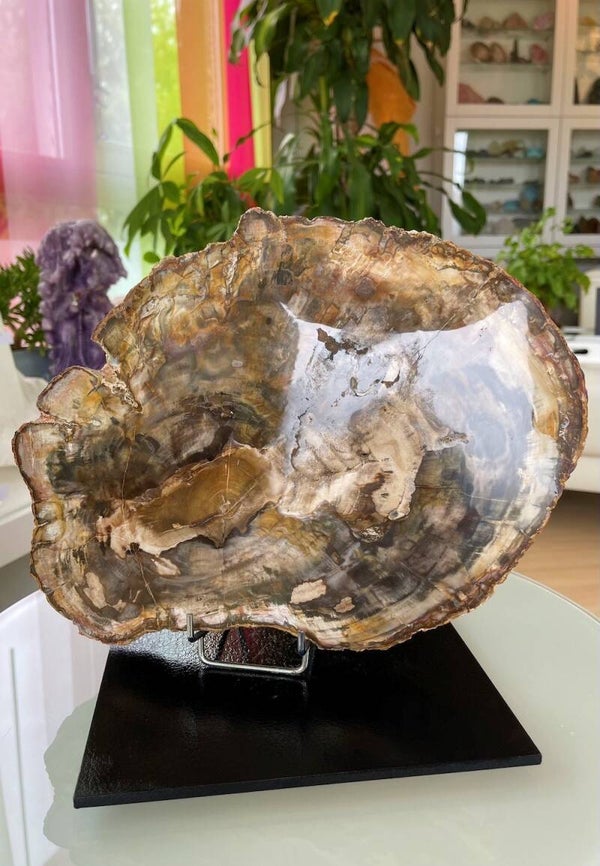Mooi stuk Versteend Hout dikke platte schijf, aan twee zijden gepolijst met ruwe buitenrand, groot, inclusief standaard
