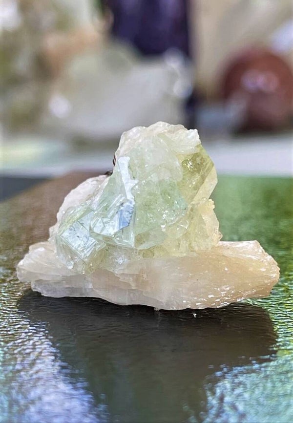Apofylliet is ook een hele spirituele steen. Het helpt bij de geleiding van energieën en kan daarom heel goed gebruikt worden bij healings en energetisch werk zoals bijvoorbeeld reiki en quantum touch. Mediteren met deze steen geeft spirituele inzichten en kennis. Het werkt aardend bij astraal reizen.