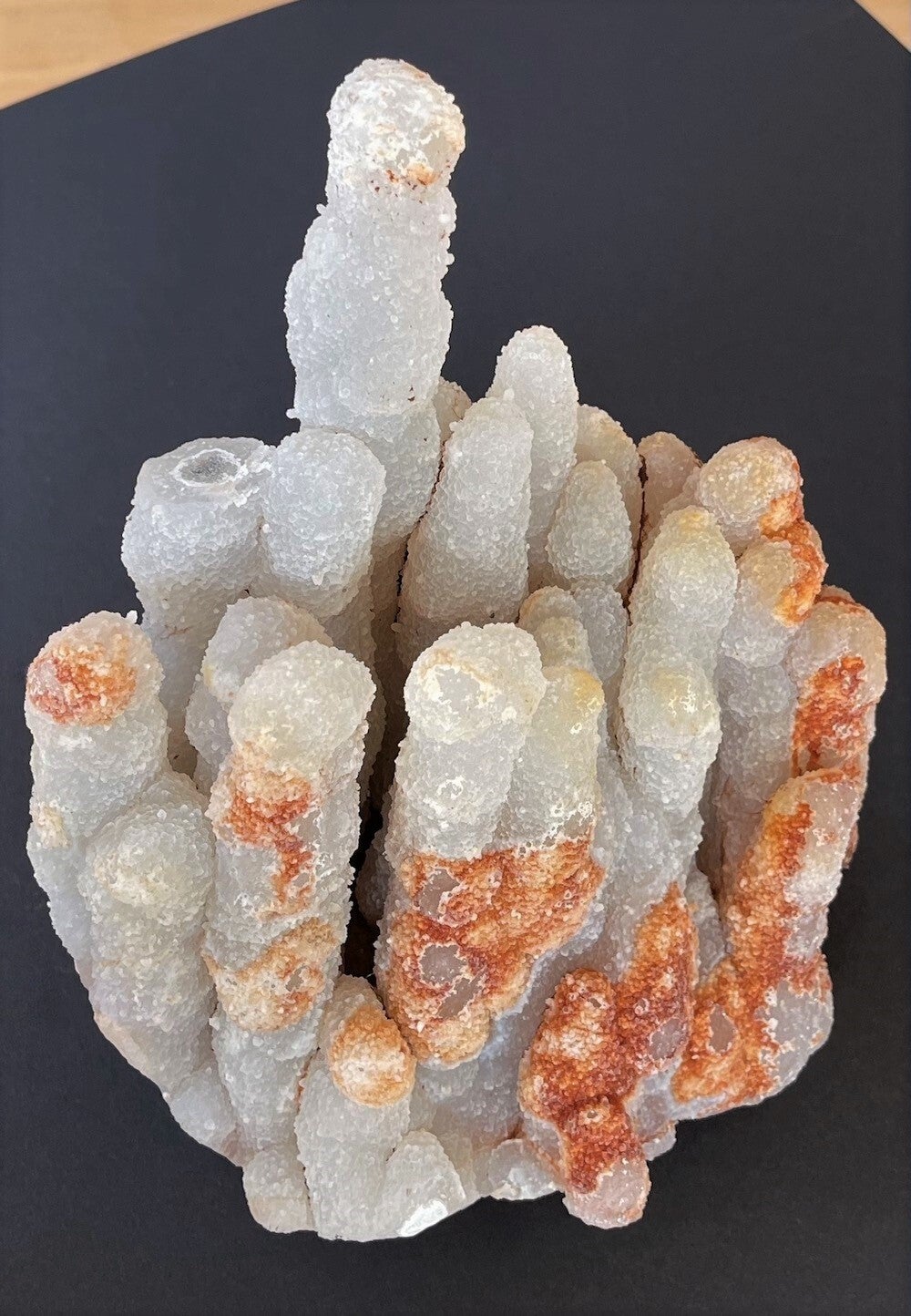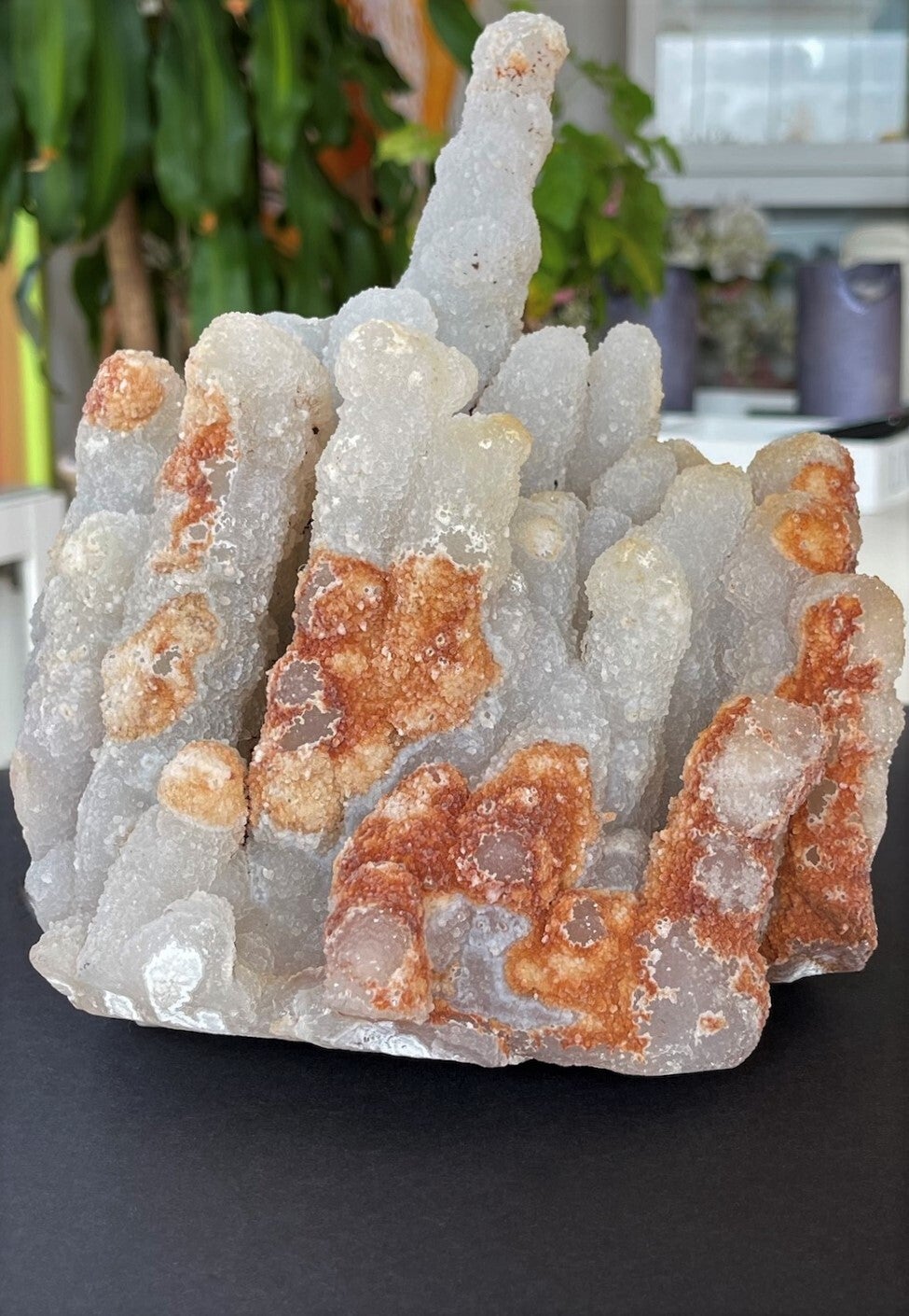 Stuk stalactiet van Chalcedoon met Anandaliet of Aurorakwarts Cluster uit de Aurora groeve, in Nashik of Nasik, Maharashtra India ruw, groot, kan staan