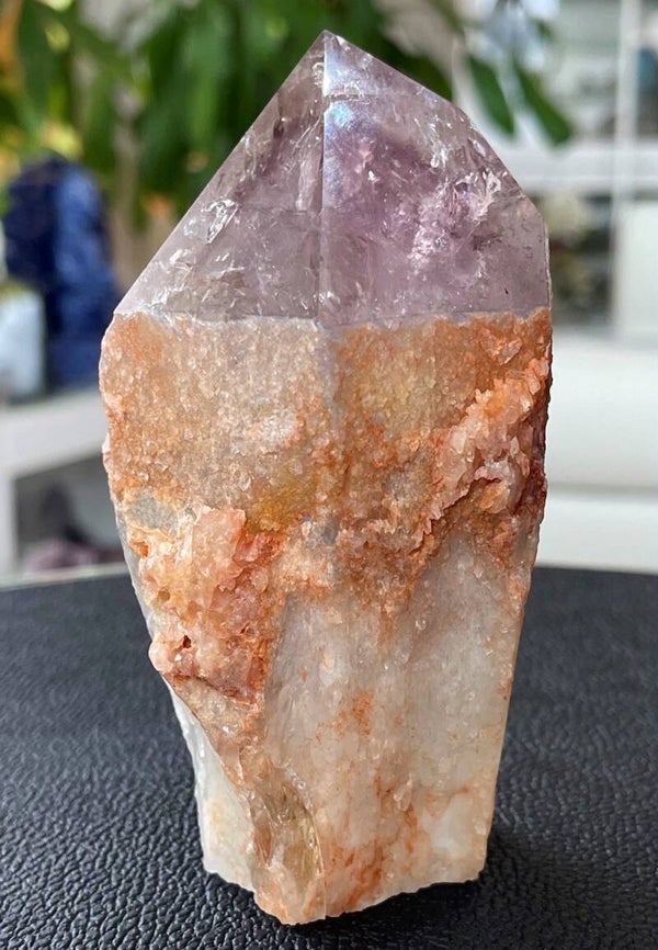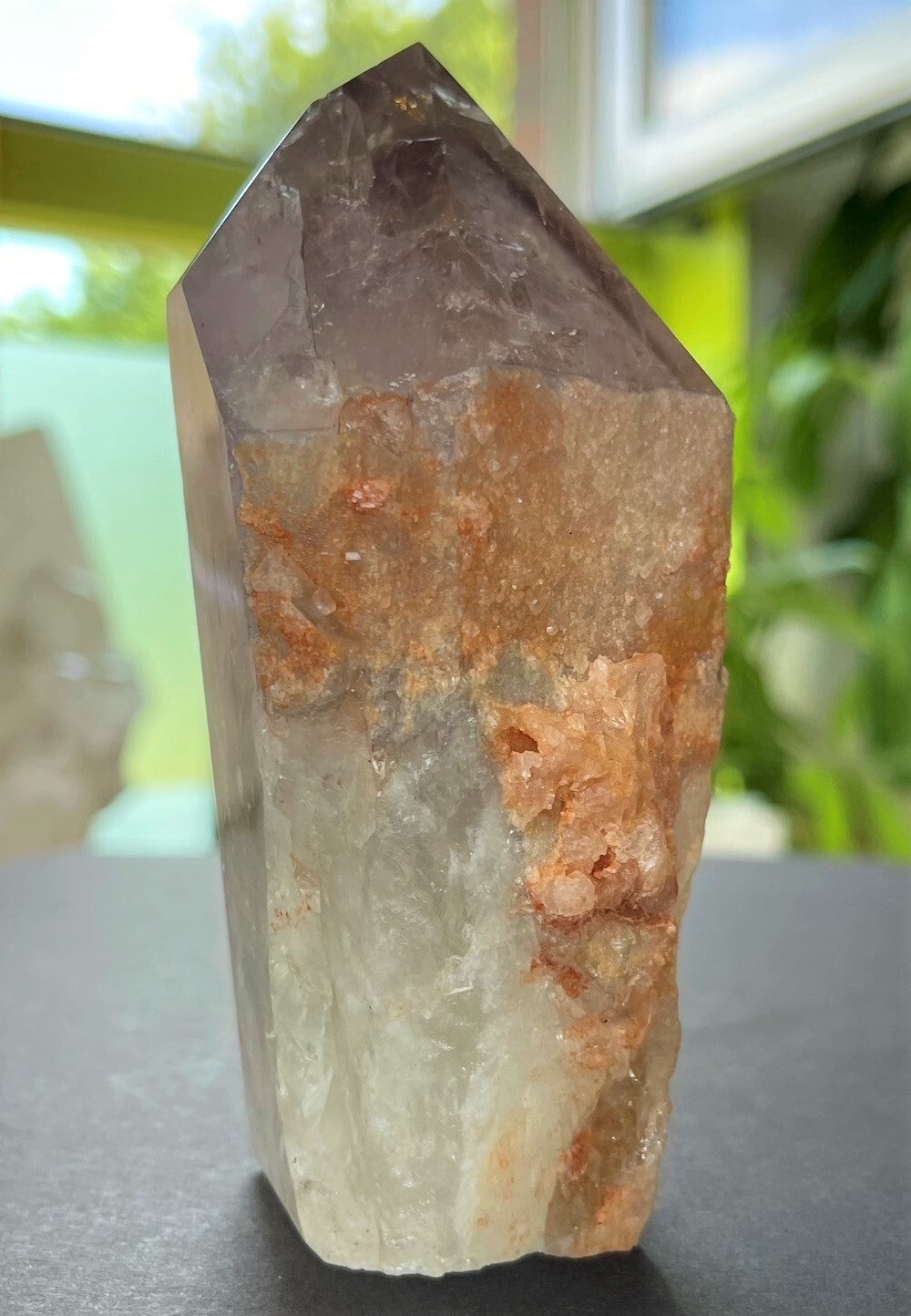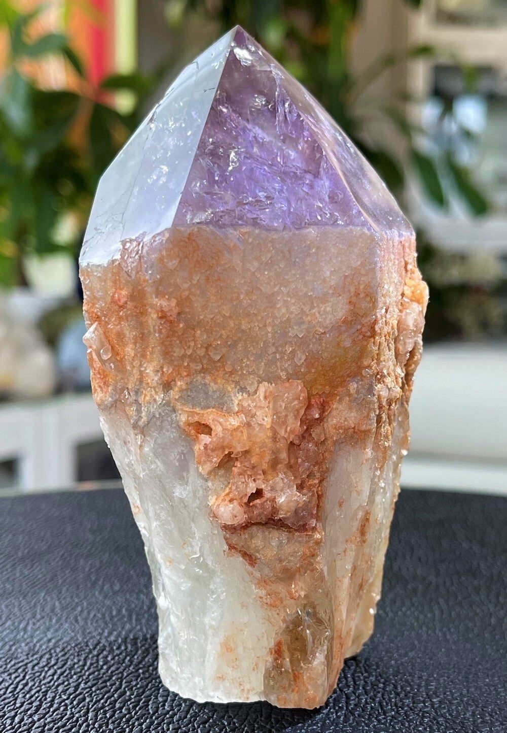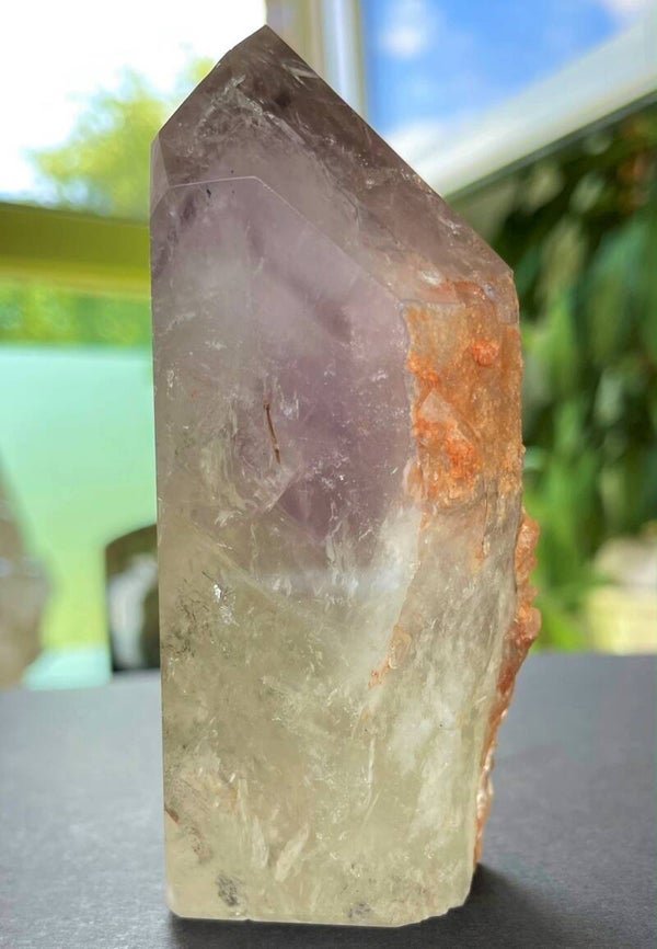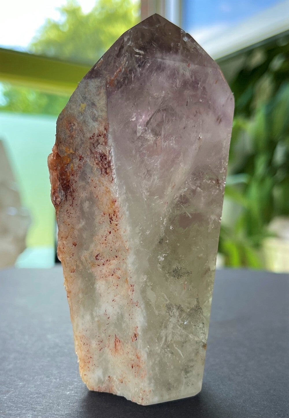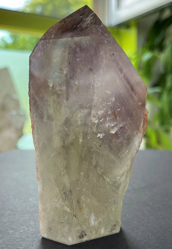 Natuurlijk gevormde Prasioliet punt met Amethist uit Brazilië, ruw en gepolijst en deel, groot
