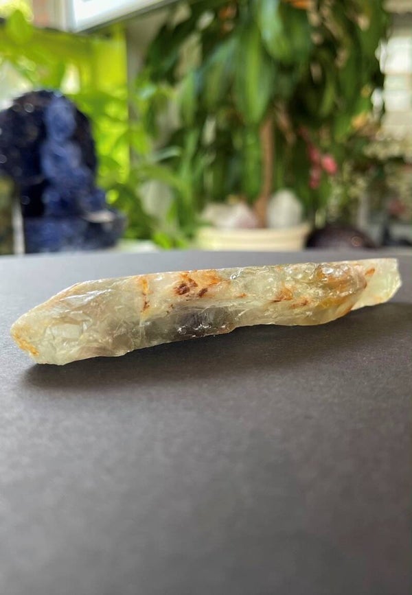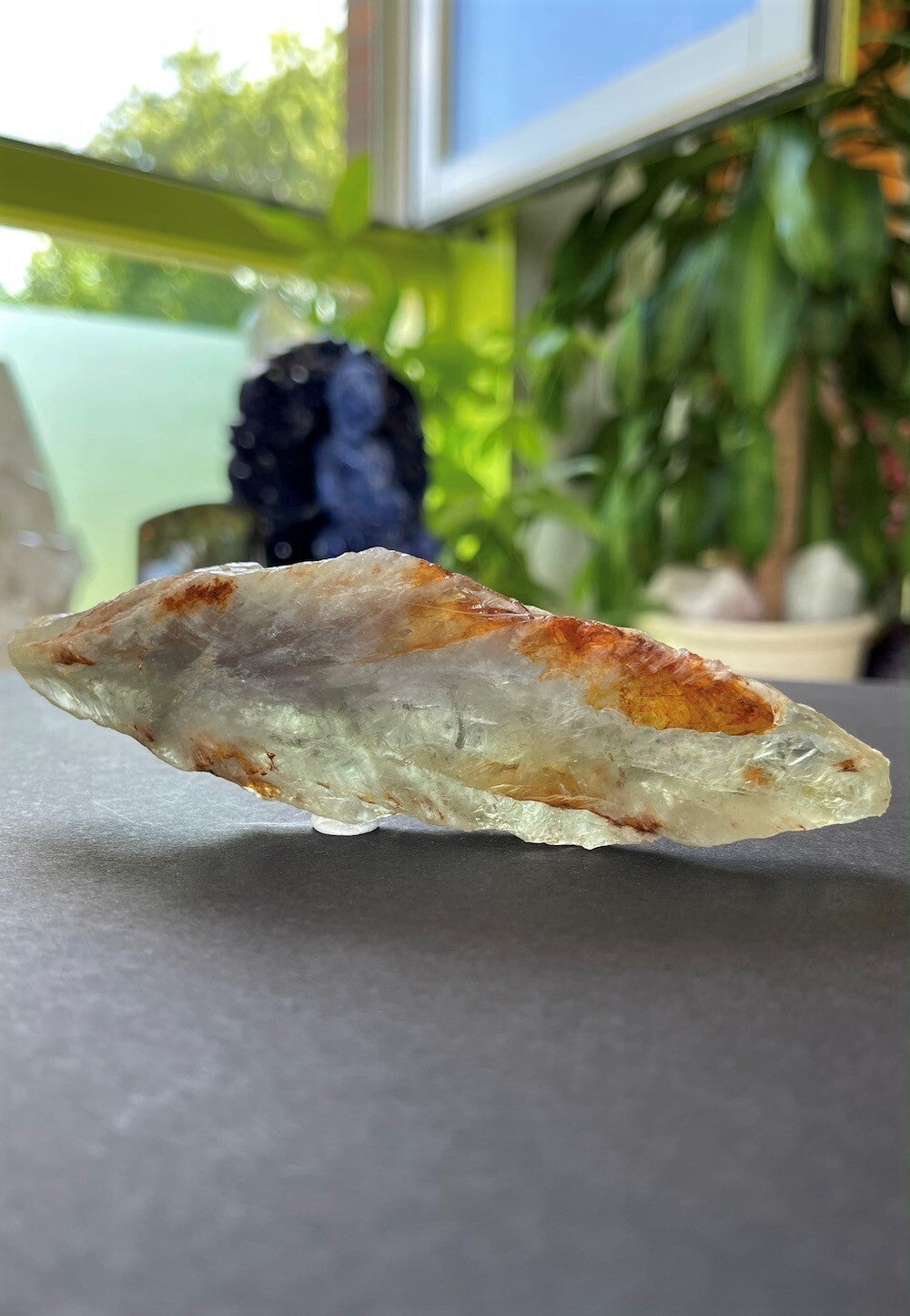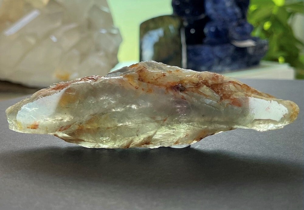 Plat stukje natuurlijk gevormde Prasioliet uit Brazilië aan twee zijden gepolijst, met ruwe buitenrand, medium