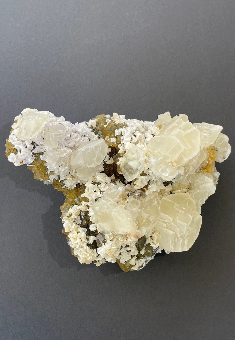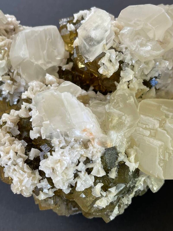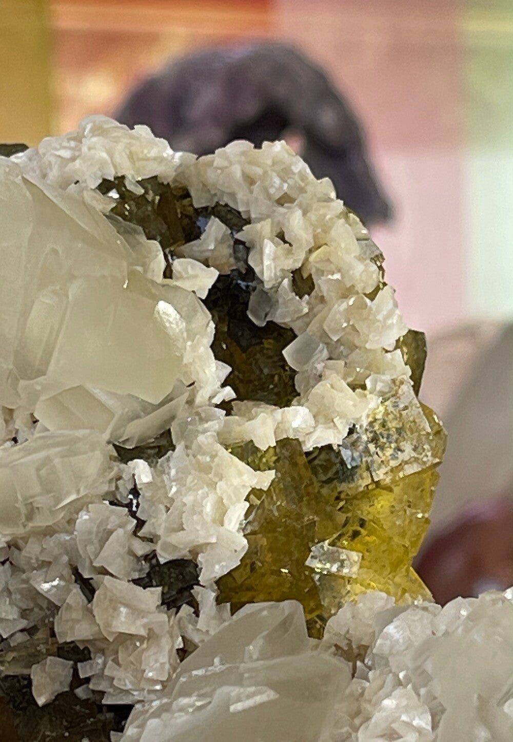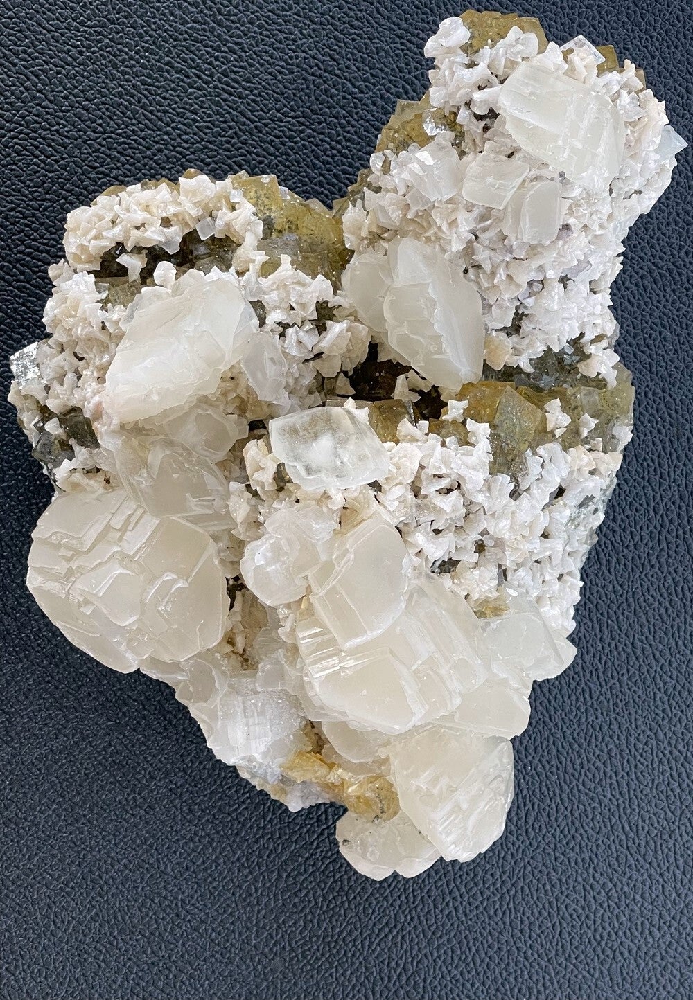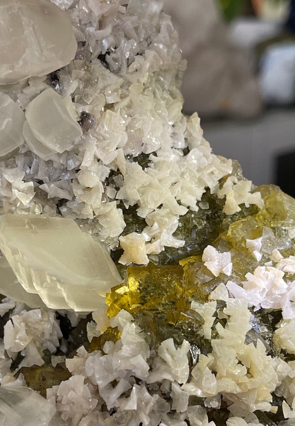 Mooi ruw stuk gele Fluoriet met Dolomiet en Calciet uit Mina Moscona, Asturias Spanje met heldere kubussen, heel groot
