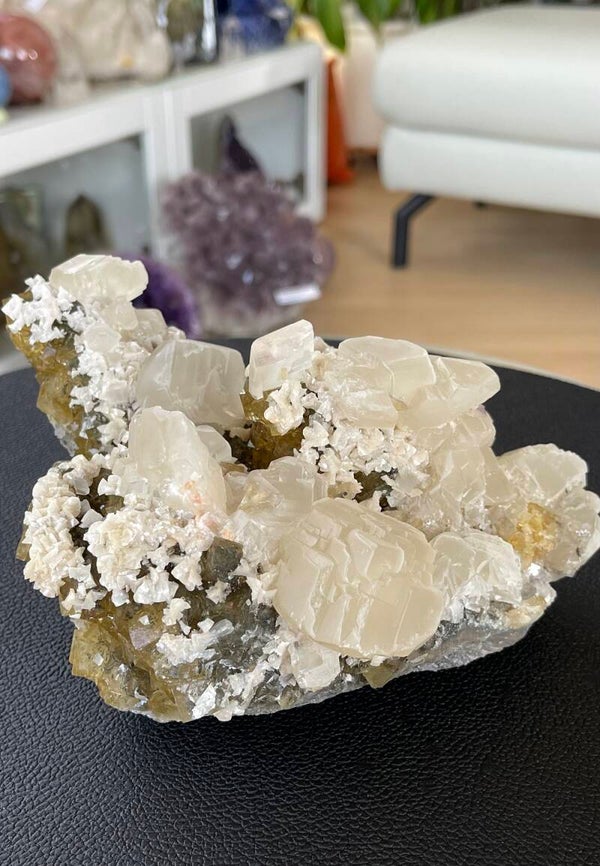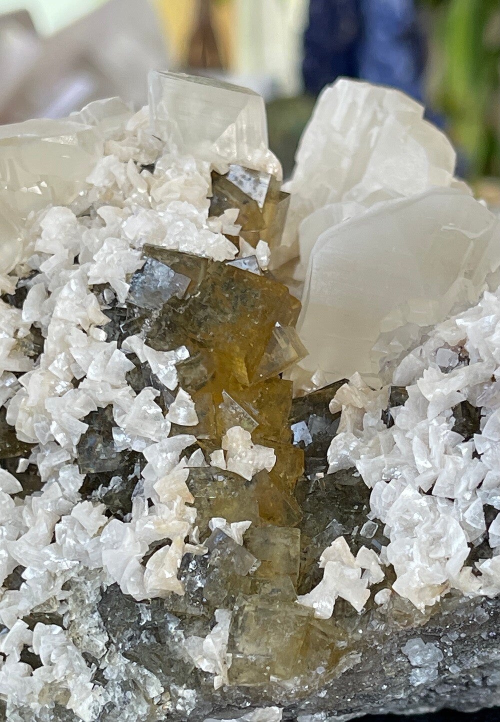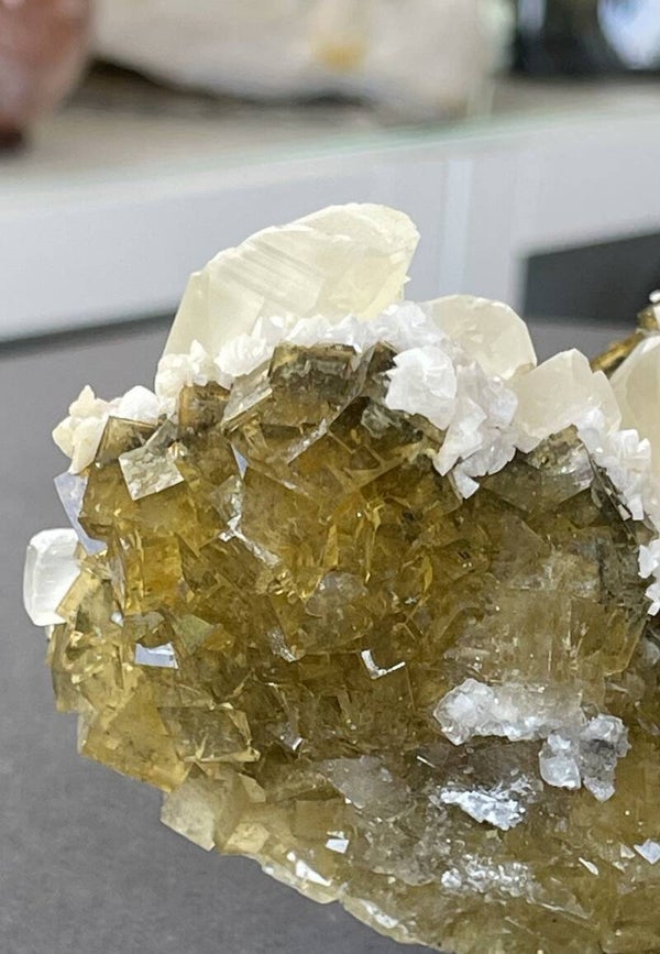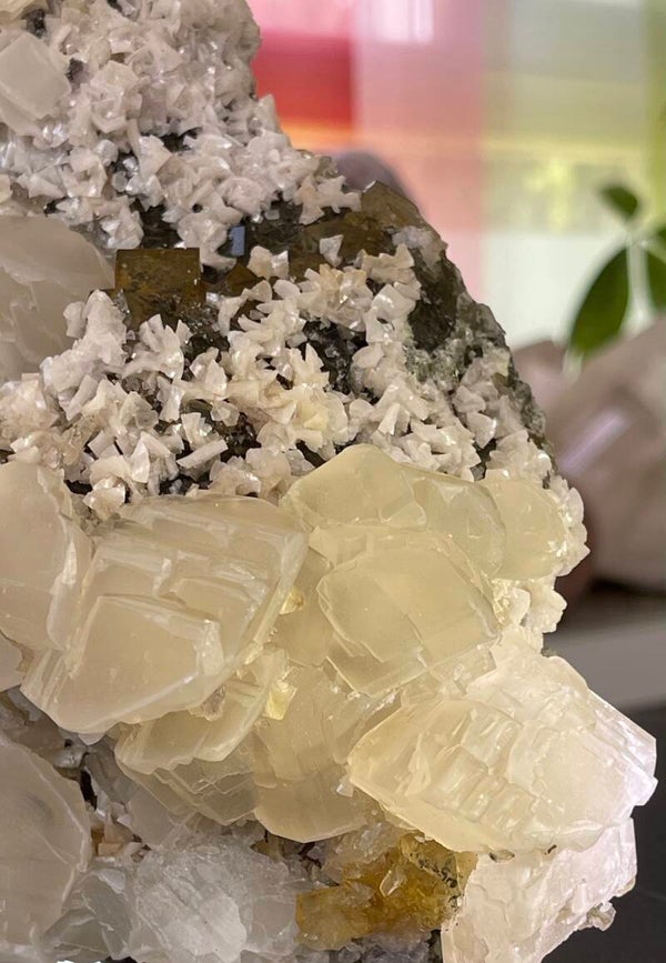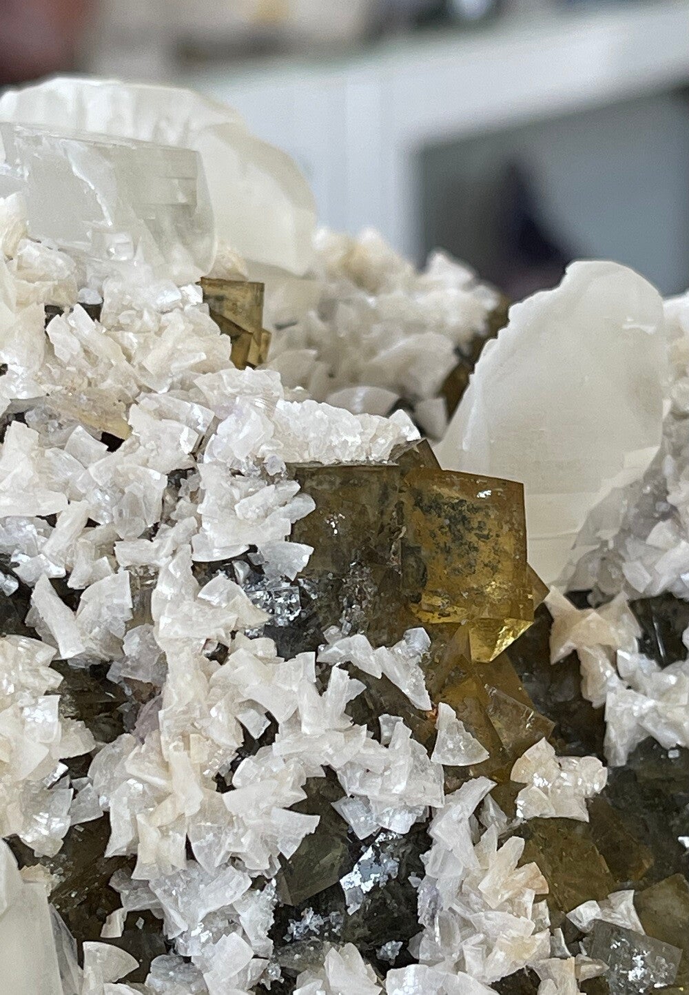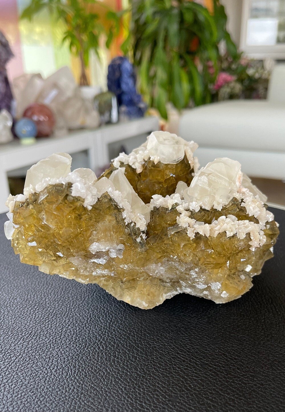 Mooi ruw stuk gele Fluoriet met Dolomiet en Calciet uit Mina Moscona, Asturias Spanje met heldere kubussen, heel groot
