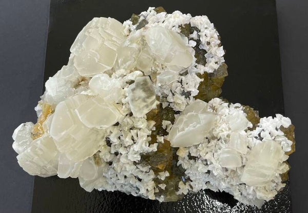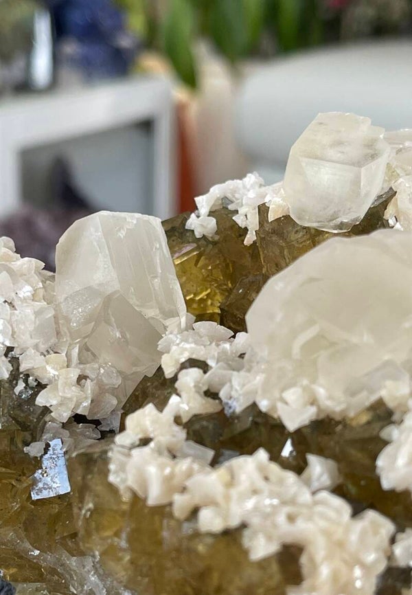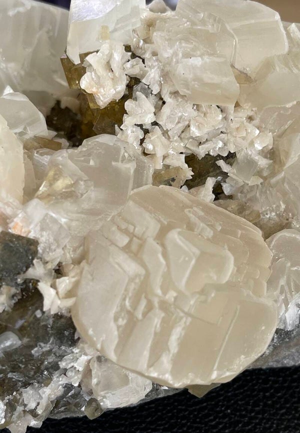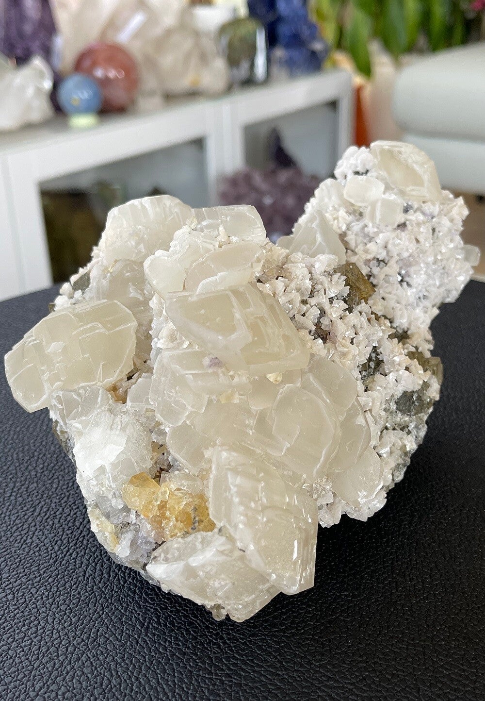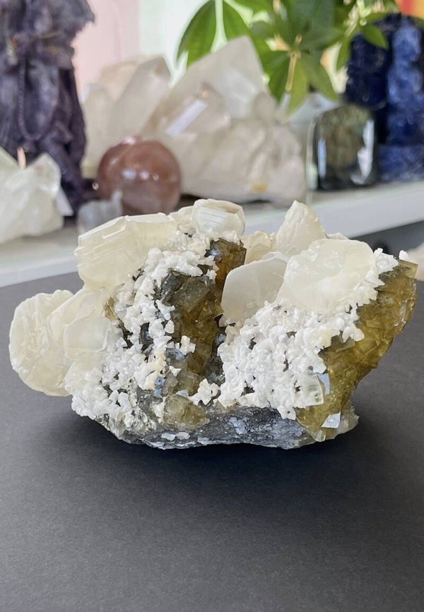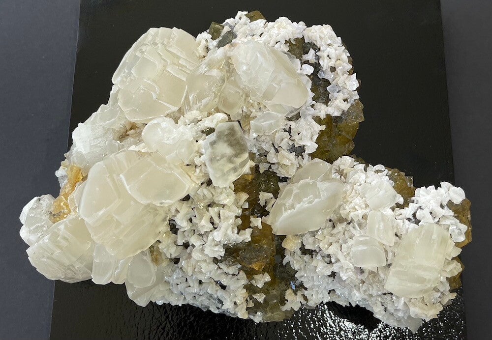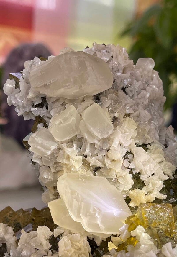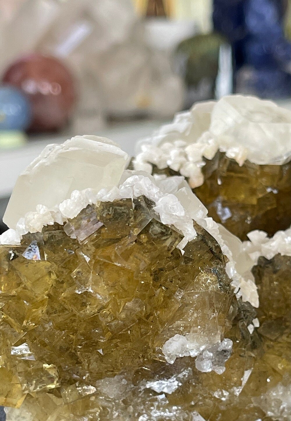 Mooi ruw stuk gele Fluoriet met Dolomiet en Calciet uit Mina Moscona, Asturias Spanje met heldere kubussen, heel groot