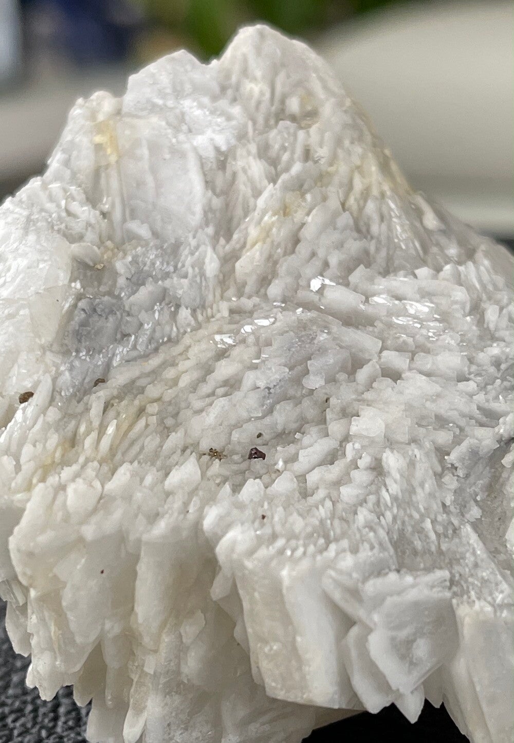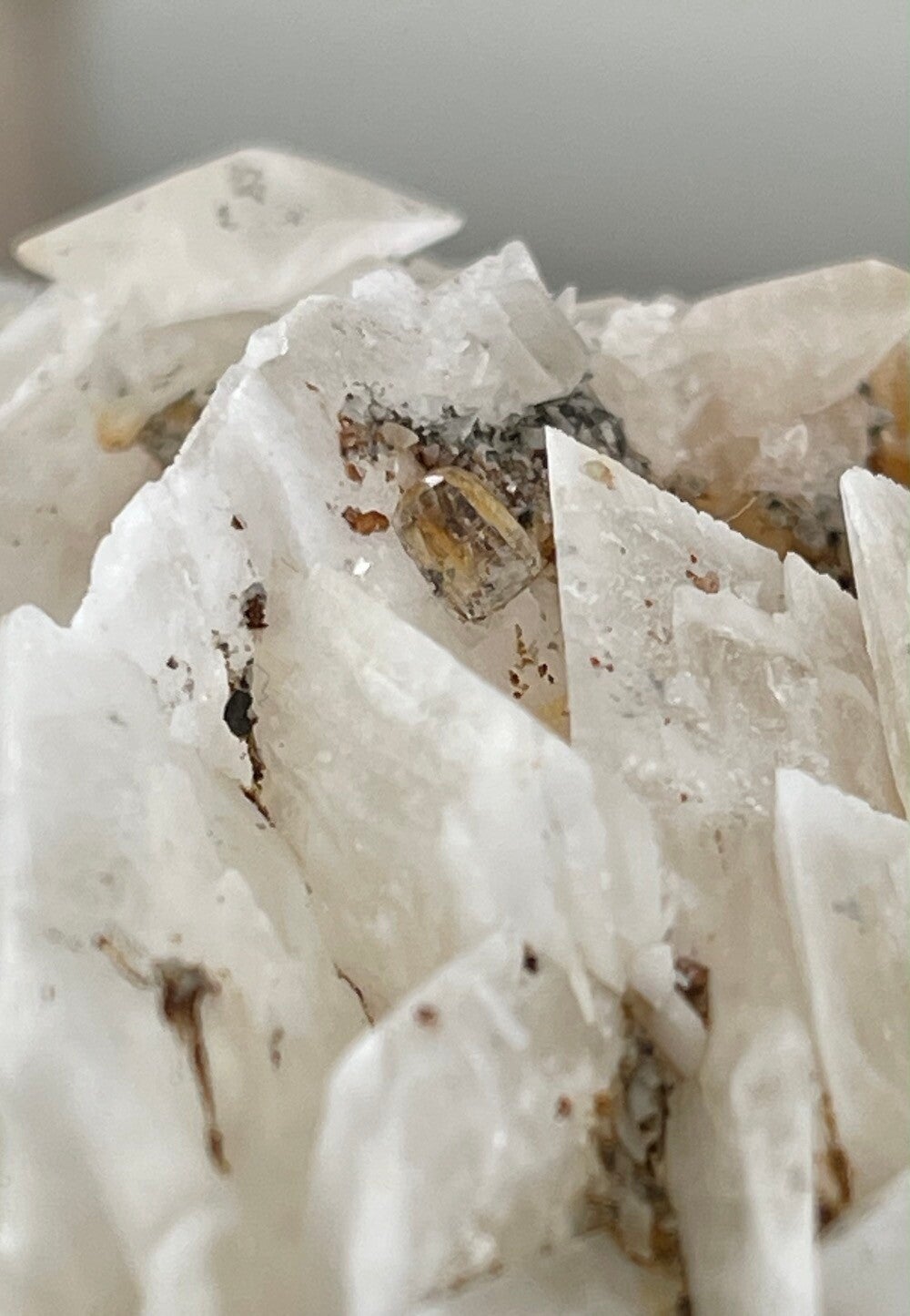 Ruw stukje witte Calciet met klein stukje witte Fluoriet en achterzijde met Bariet uit Emilio mijn, Asturias Spanje, medium