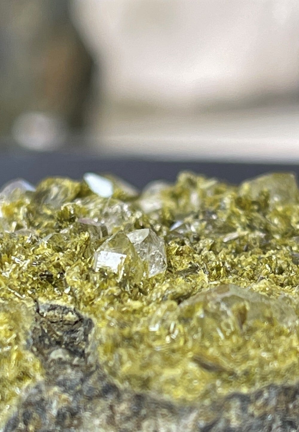 Ruw stukje Epidoot Pistacita Clinozoisiet met Kwarts Kristal op matrix uit Cantera Sierra y Lomas cantera Los Serranos, Albatera commundad Valencia Spanje, medium