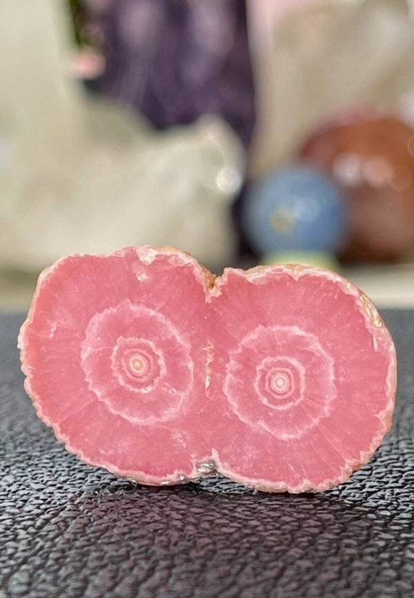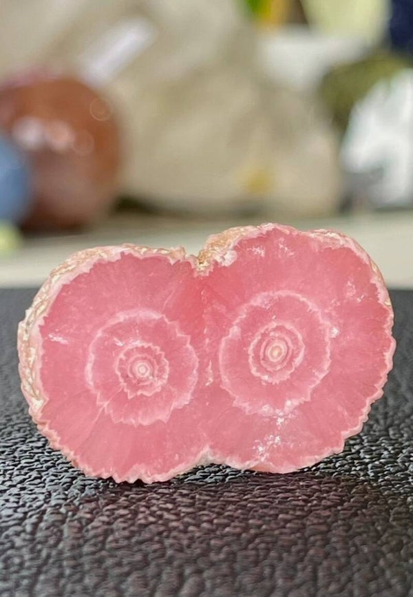 Plakje Rhodochrosiet edelsteen met ruwe buitenrand, plat schijfje, aan beide zijden gepolijst, klein tot medium