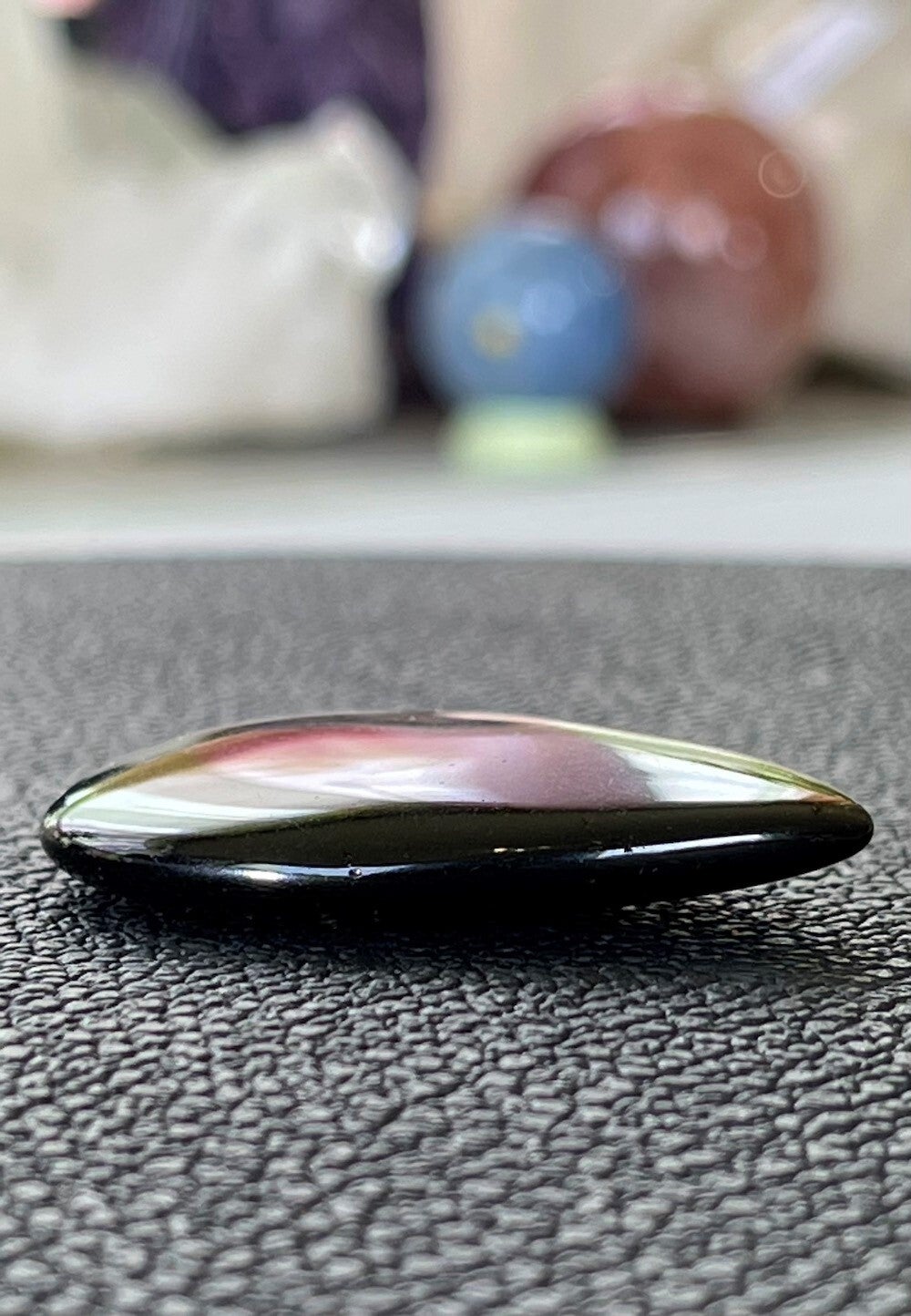 Platte Goudobsidiaan edelsteen cabochon druppel uit Mexico, met afgeronde zijkant, aan beide zijden een prachtige glans, groot