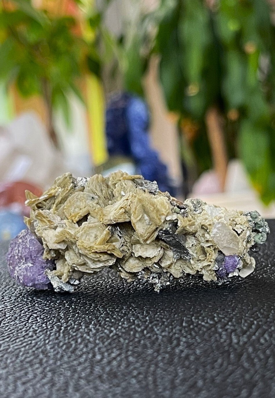 Paarse Fluoriet met Muscoviet, Arsenopyriet, Sideriet en Bergkristal uit Portugal ruw, medium