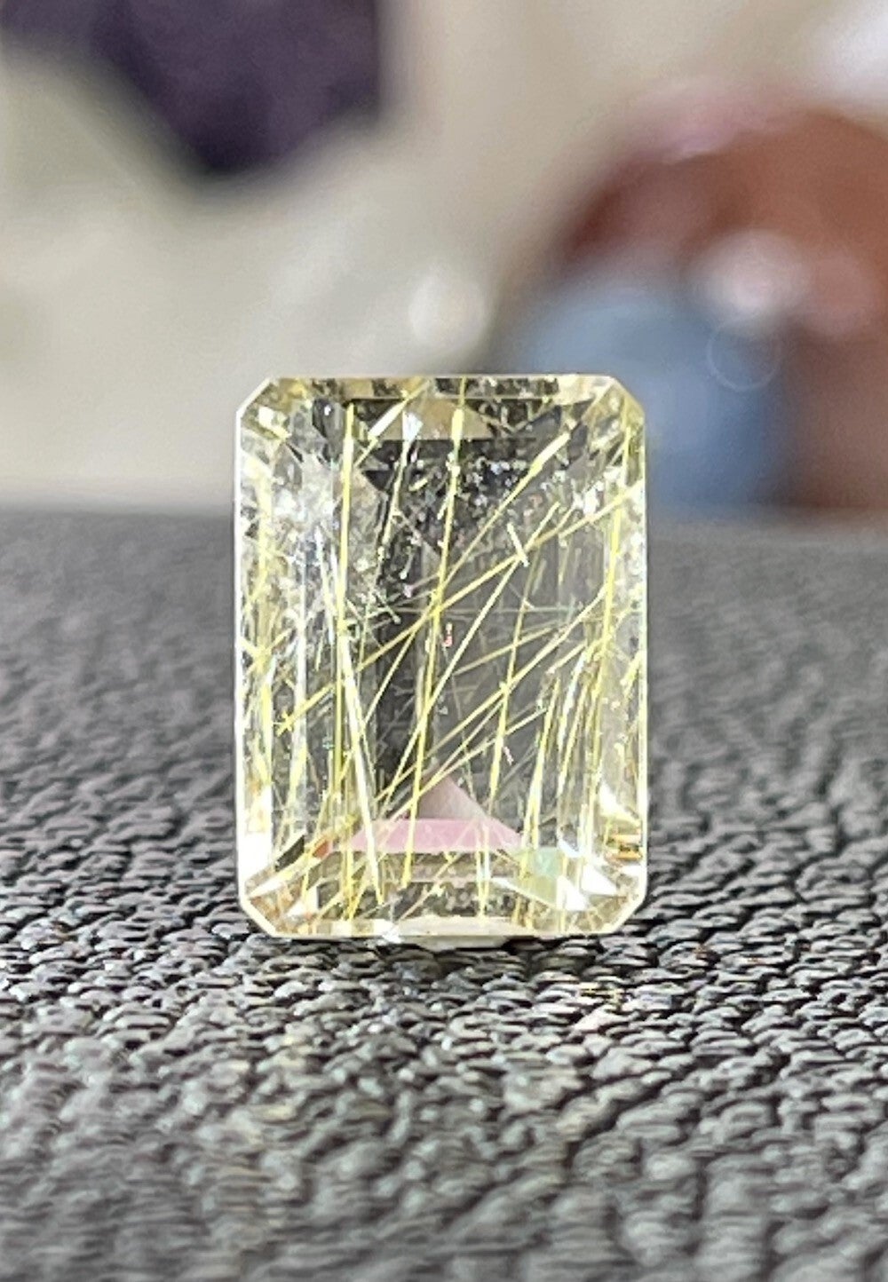 Gouden Rutielkwarts edelsteen uit Brazilië, facet geslepen emerald- of smaragd octagon-vorm rechthoekig, medium tot groot