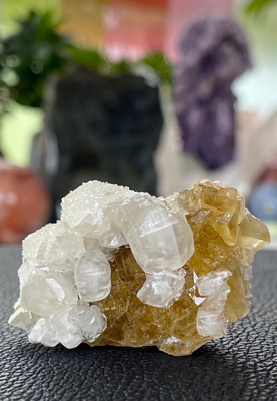 Ruw stukje gele Fluoriet met Calciet en Calciet-kristallen uit Mina Moscona, Asturias Spanje, klein