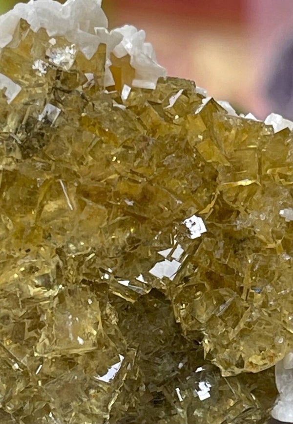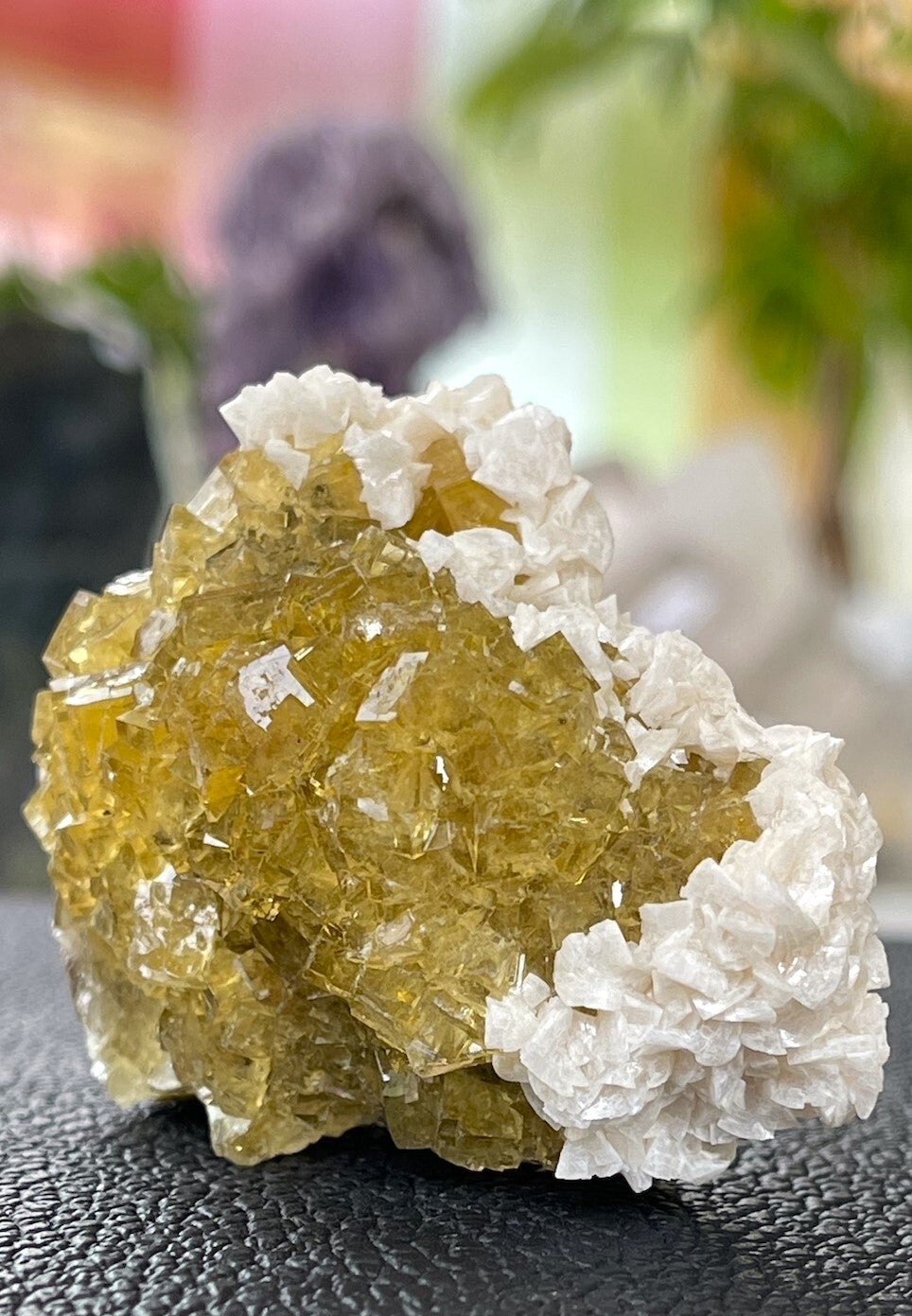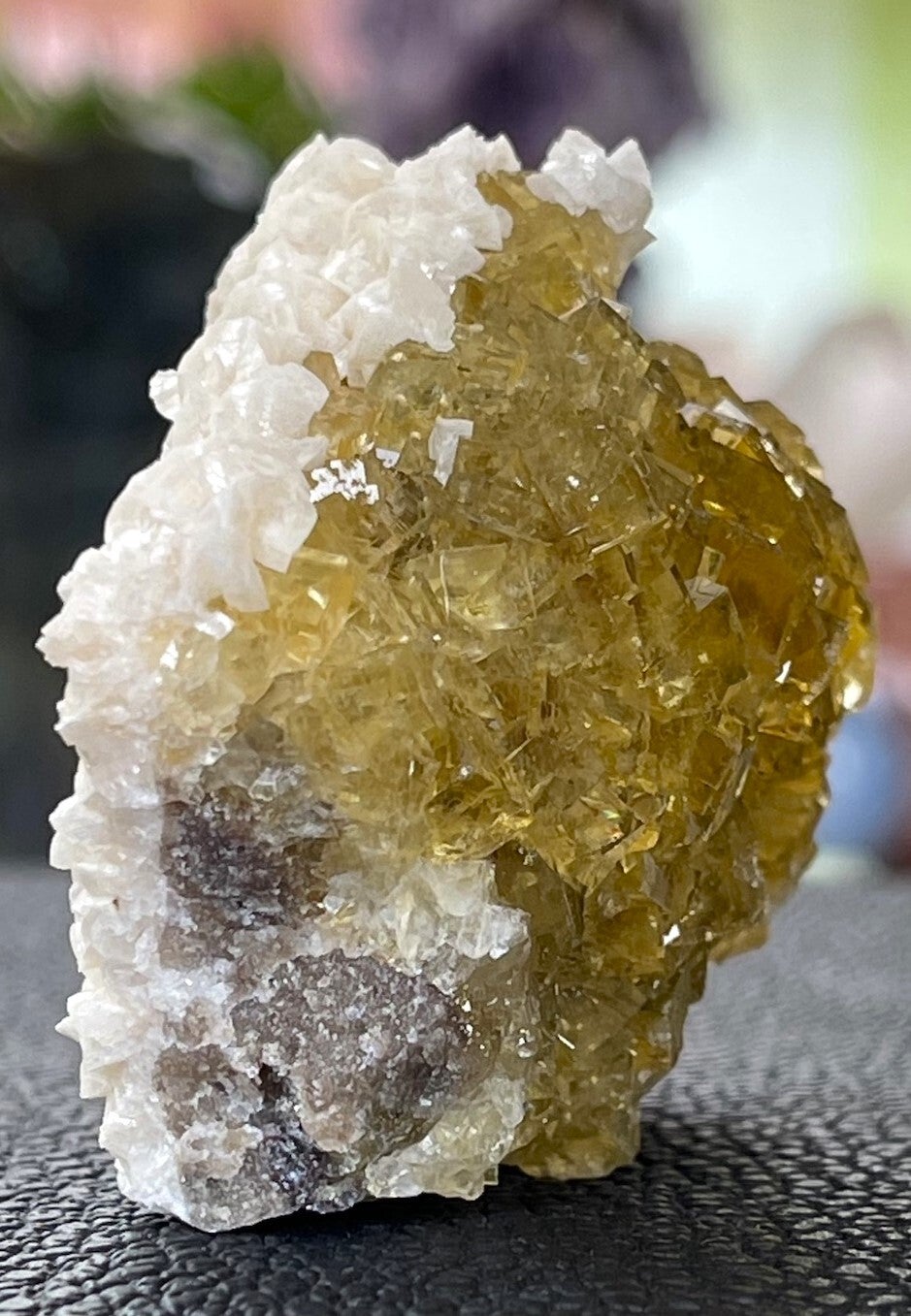Een bijzonder mooi ruw stukje gele Fluoriet met Dolomiet uit Mina Moscona, Asturias Spanje, medium