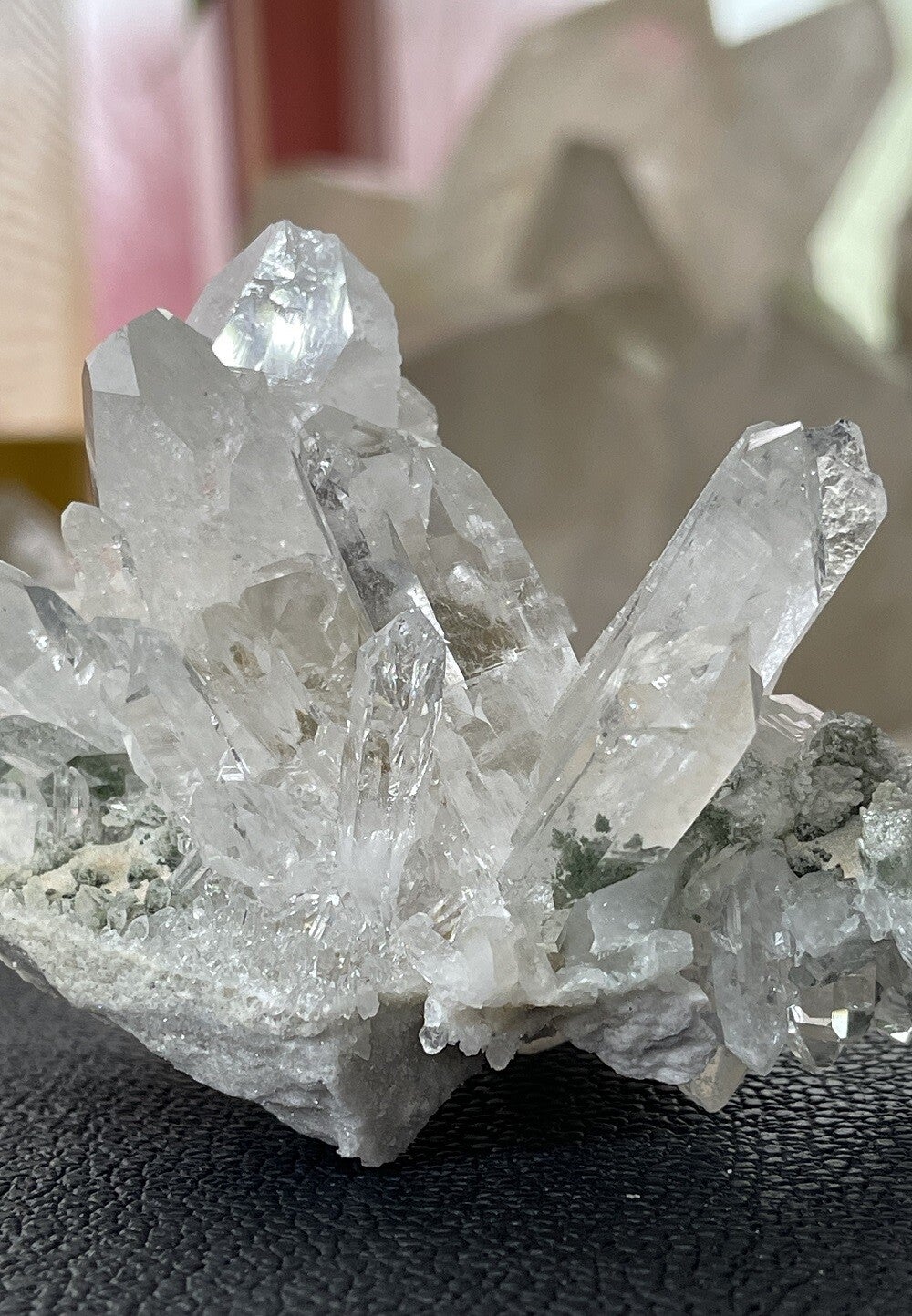 Ruw stukje Bergkristal cluster met Choriet uit de Himalaya, India met heldere punten, medium