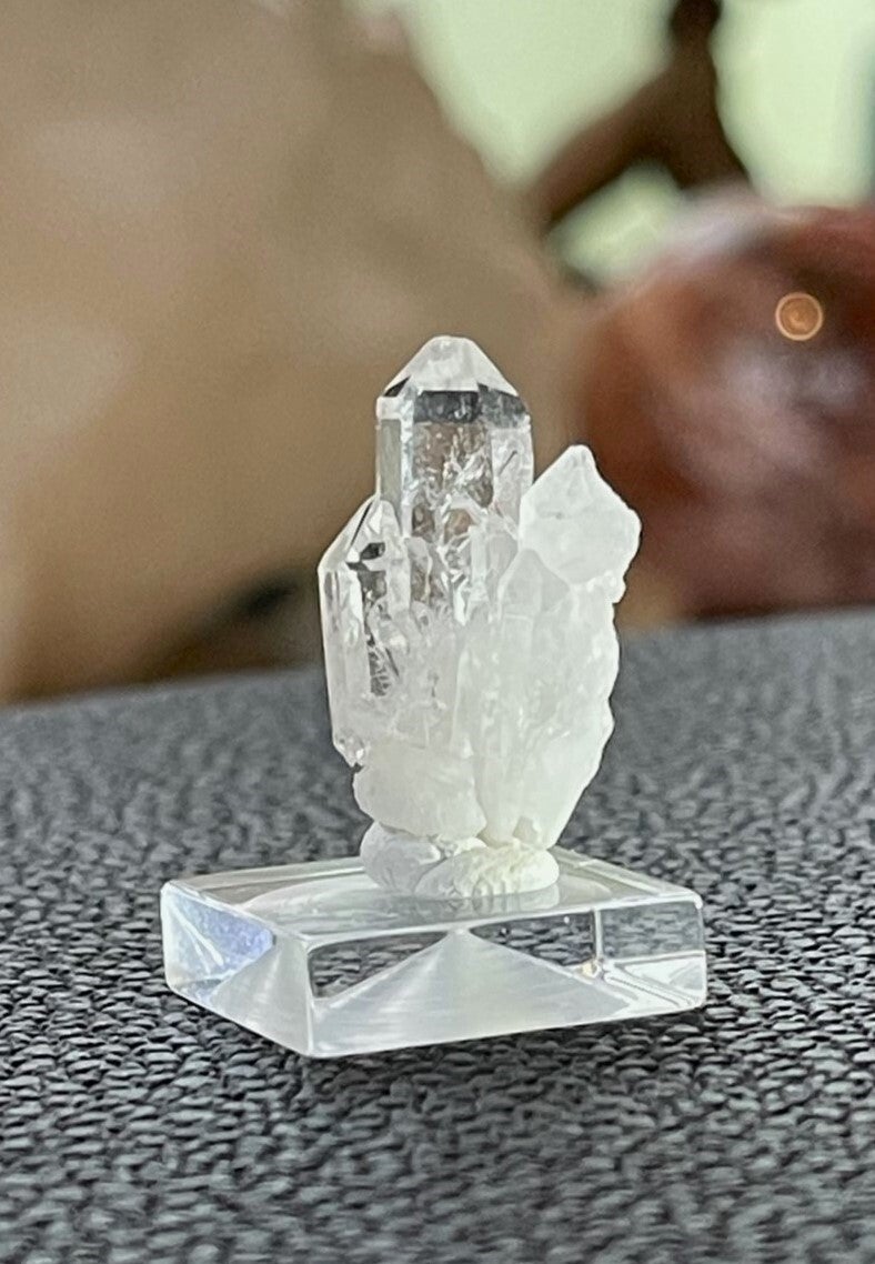 Heldere samengegroeide puntjes Bergkristal uit Brazilië, met sokkel, heel klein