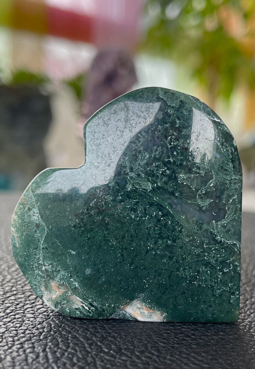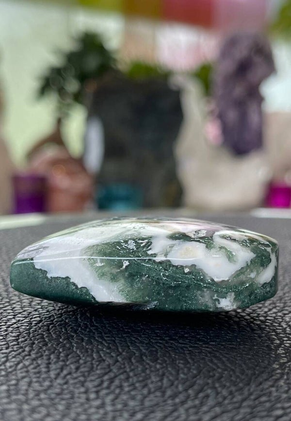 Mosagaat is dus heel geschikt om bij je te dragen ter ondersteuning van herstel na ziekte, om tot rust te komen na een periode met veel emotionele onrust of om weer tot jezelf te komen. De steen geeft je het gevoel op je plek te zijn en laat je ware ik naar boven komen. Het laat je de kern en wat écht belangrijk is om je heen en in jezelf zien. Oppervlakkigheden, vooroordelen en zaken die afleiden van de essentie vallen hierbij weg.