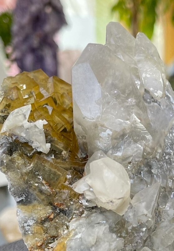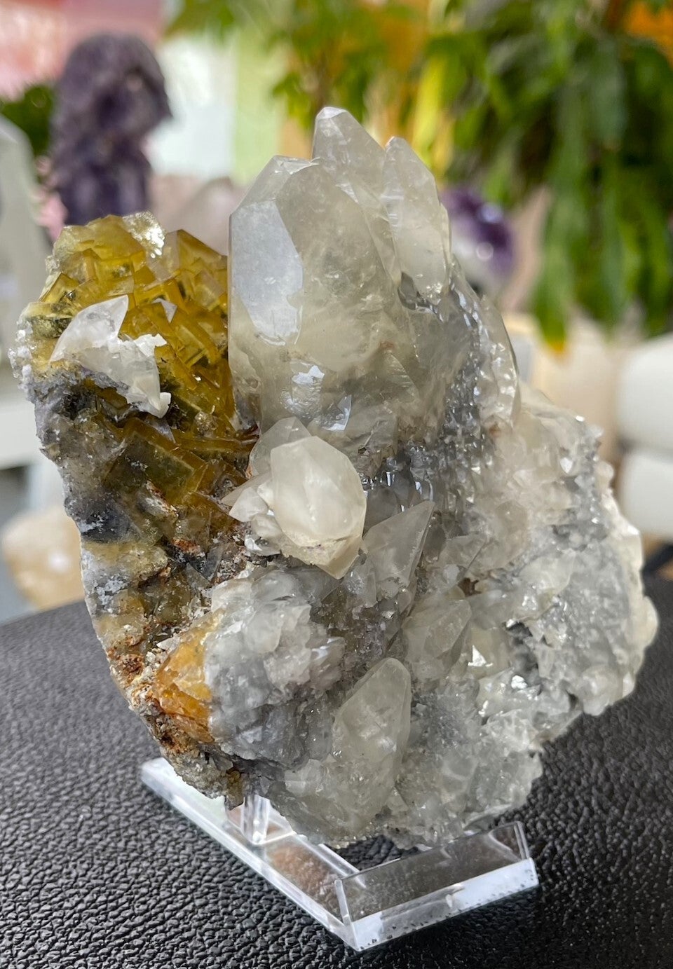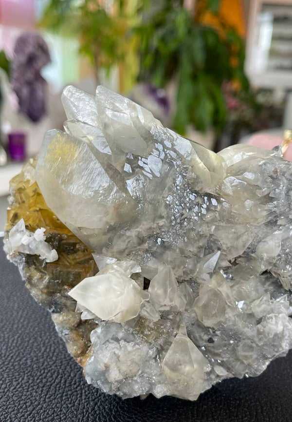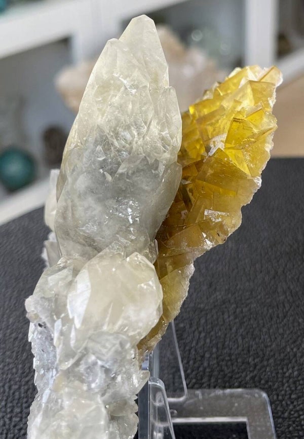 Bijzonder ruw stuk met prachtige, glanzende, Calciet punten op gele Fluoriet uit Mina Moscona, Asturias Spanje, groot