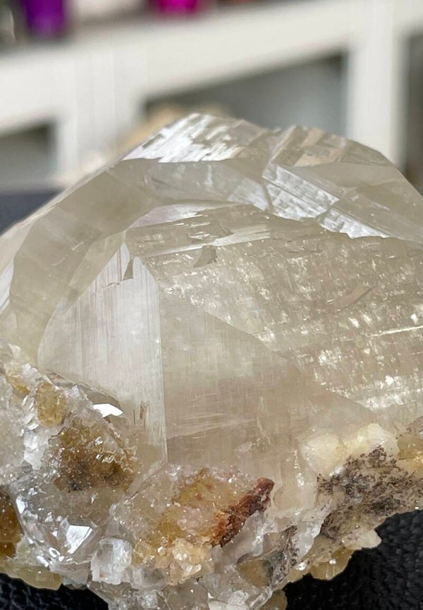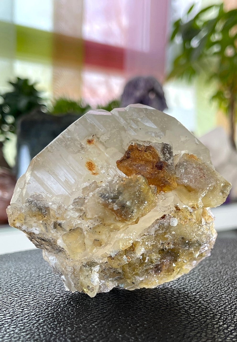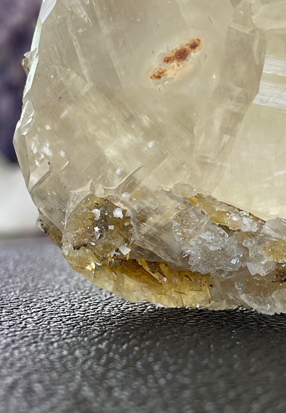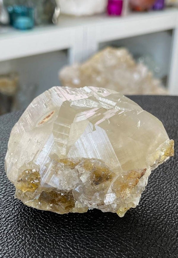 Prachtig ruw stuk Calciet, met puntvorming op gele Fluoriet matrix uit Mina Moscona, Asturias Spanje, medium