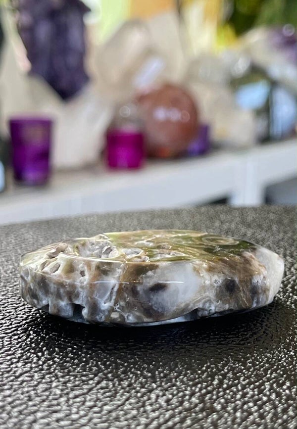 Aparte Chalcedoon handsteen met gekristalliseerde open stukjes, medium