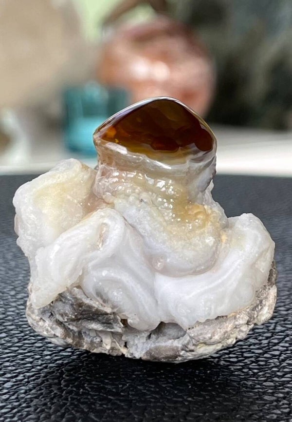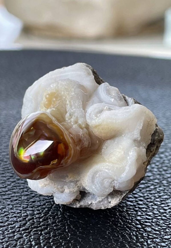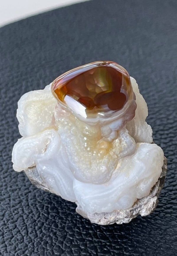 Heel apart mooi ruw stukje Vuuragaat, bovenkant gepolijst, klein tot medium