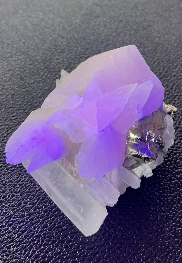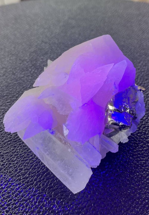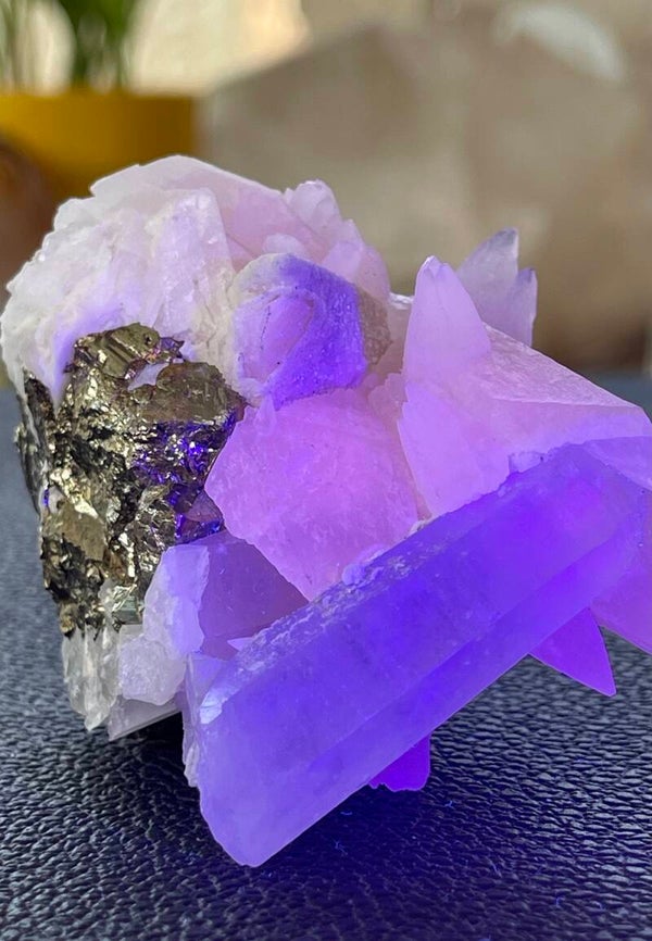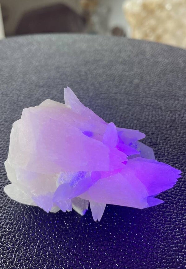 Een fluorescerende steen die onder UV-licht een diepe paars-roze kleur krijgt