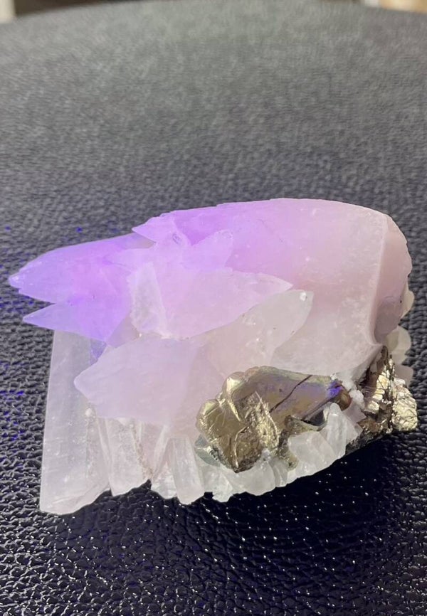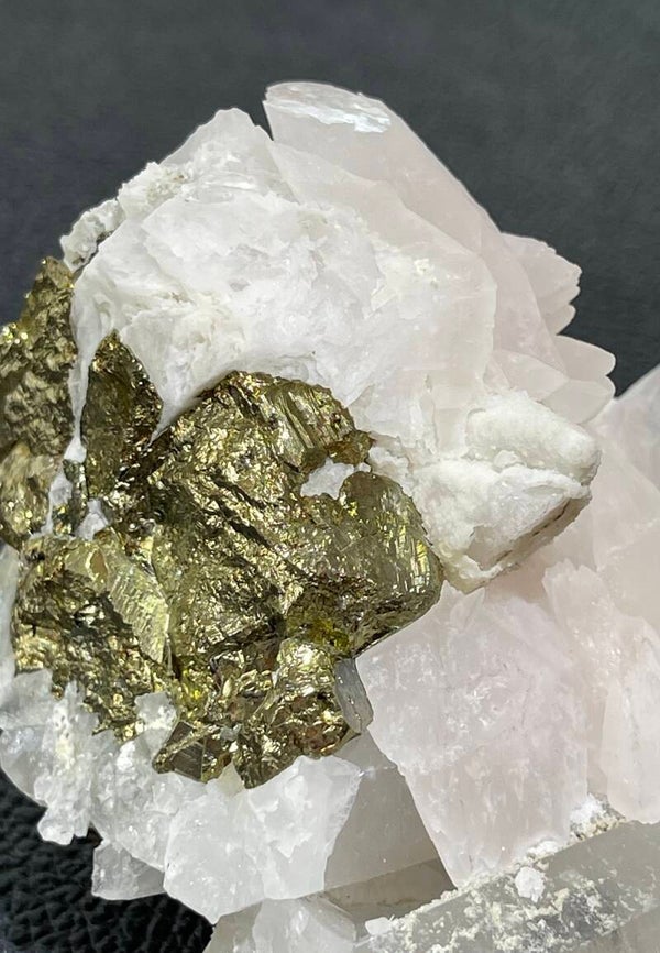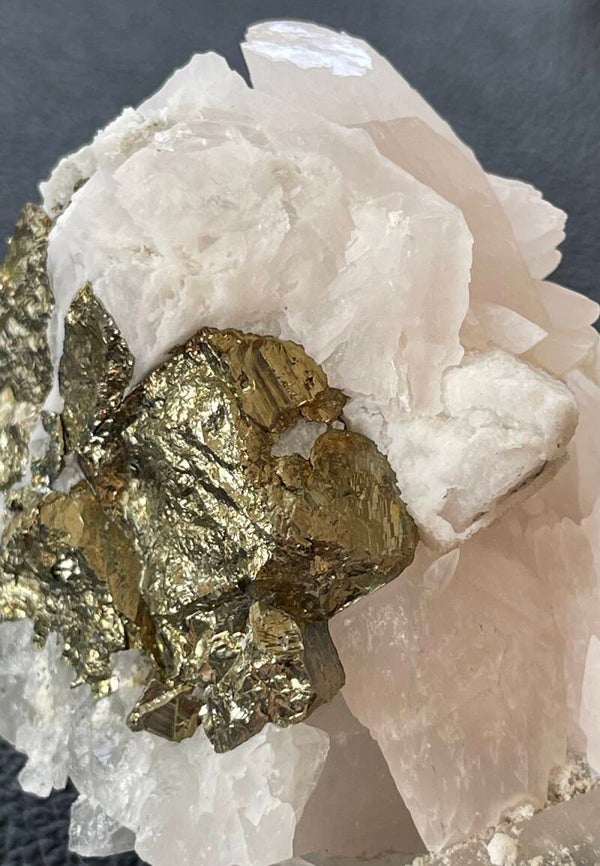 Heel bijzonder ruw stukje Mangaan Calciet op Pyriet en Kwarts uit de Racracacha mijn, Provincie de Pasco, Capital Cerro de Pasco Lima, Peru, medium