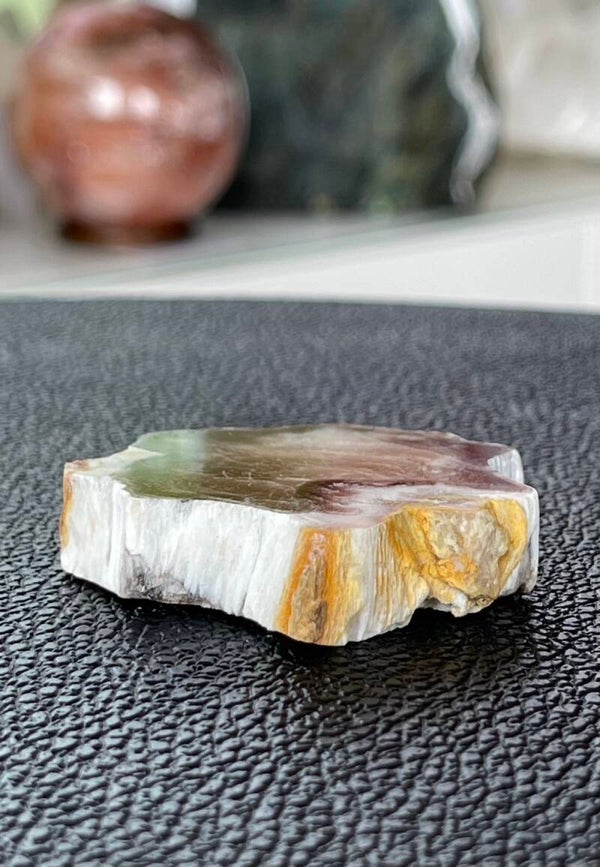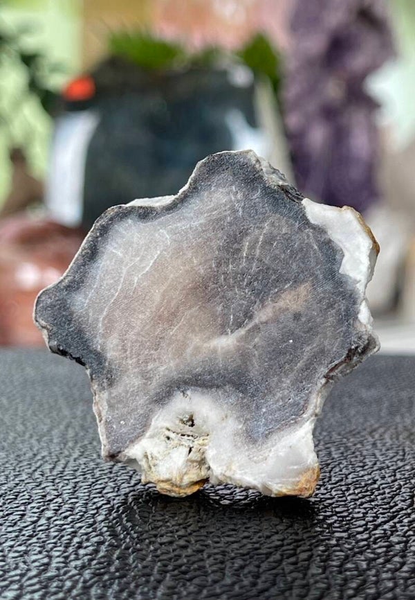 Mooi plat stukje Versteend Hout uit Hongarije, aan één zijde gepolijst, met witte ruwe buitenrand, klein