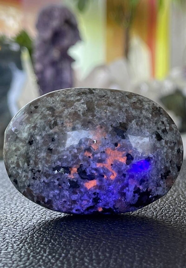 Deze fluorescerende Syeniet met Sodaliet, bekend onder de handelsnaam ‘Yooperliet’ licht prachtig oranje op onder een UV-lamp.