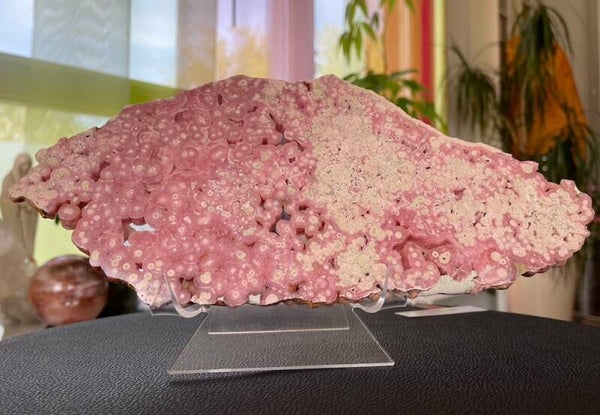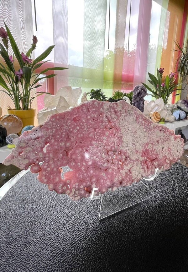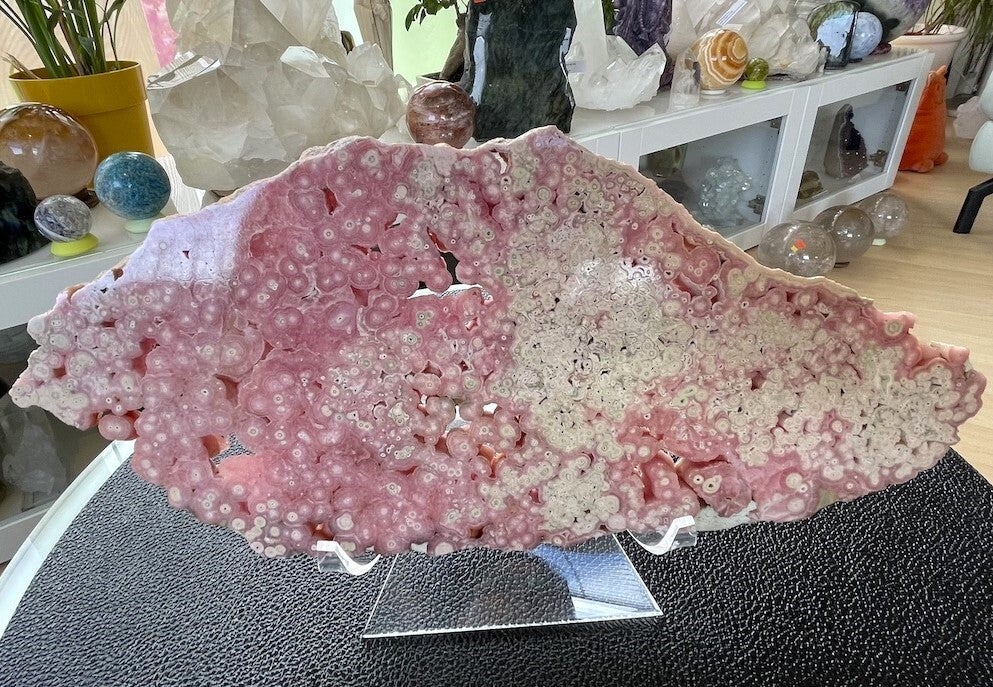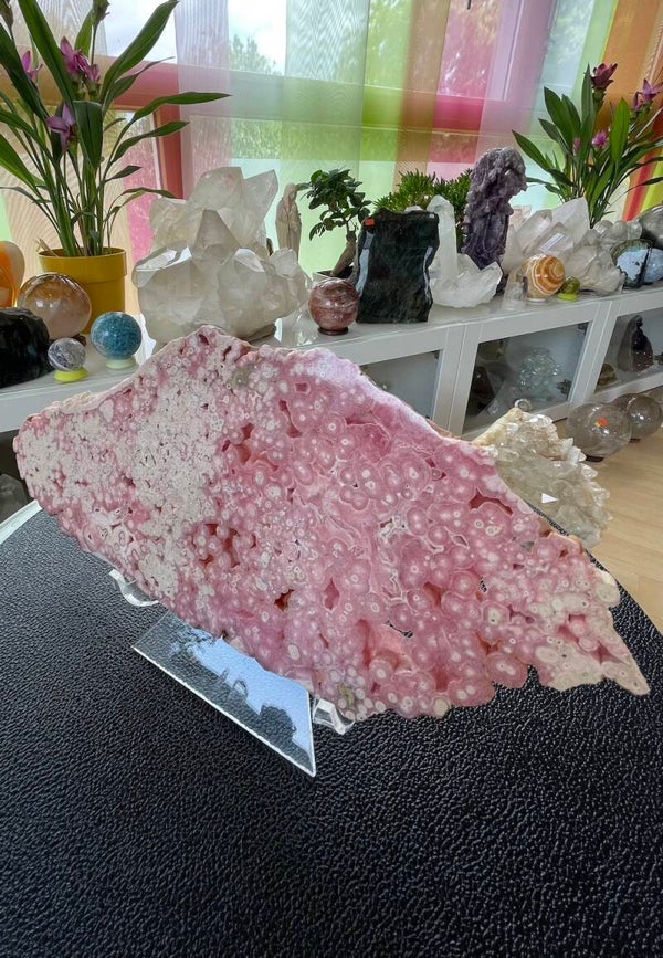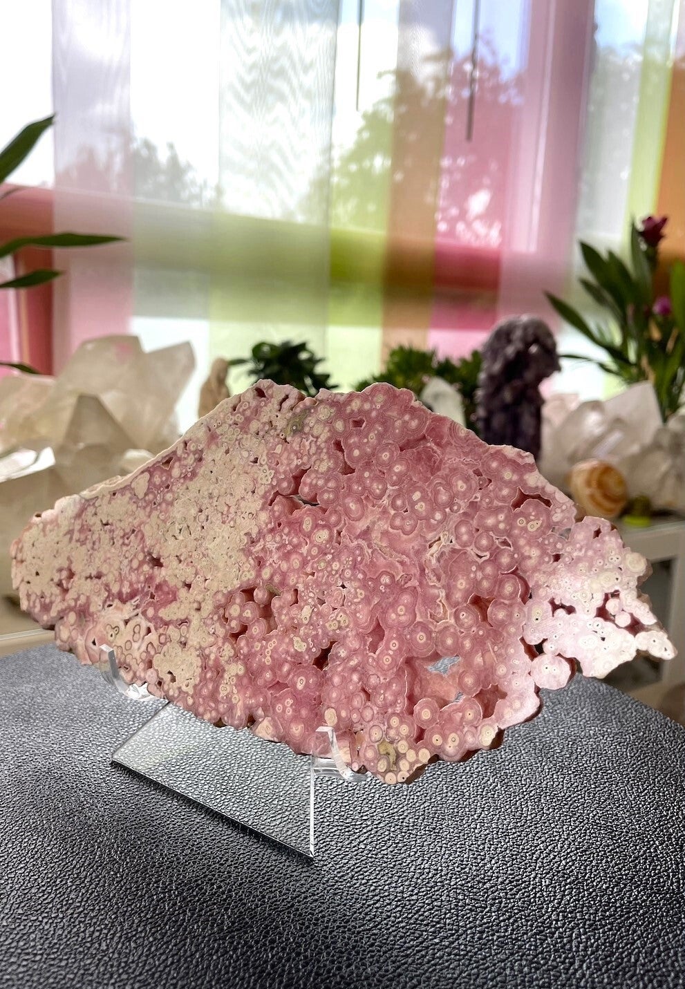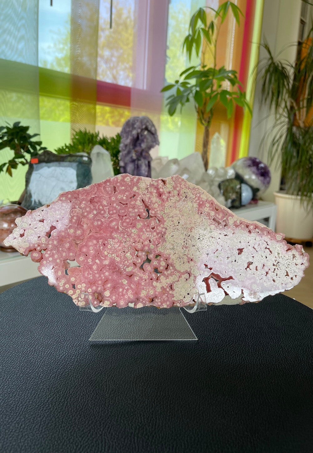 Mooi plat stuk Rhodochrosiet uit Argentinië, aan twee zijden gepolijst, ruwe buitenrand, groot. Een heel bijzonder stuk