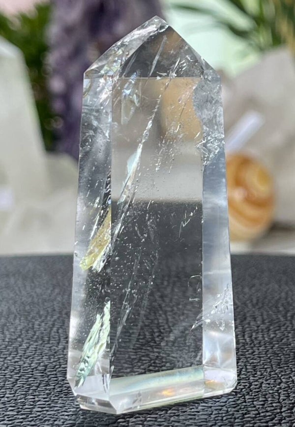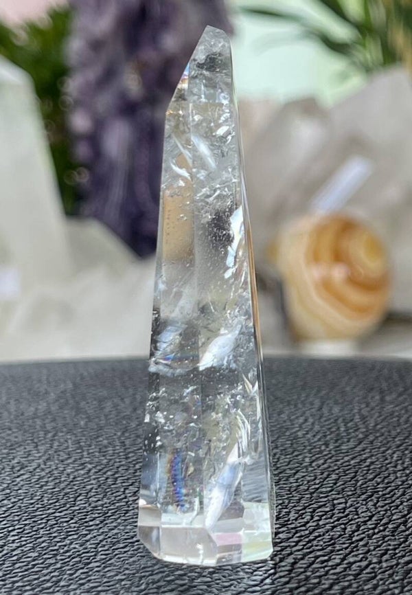 Mooie heldere Bergkristal punt met regenboog, gepolijst.