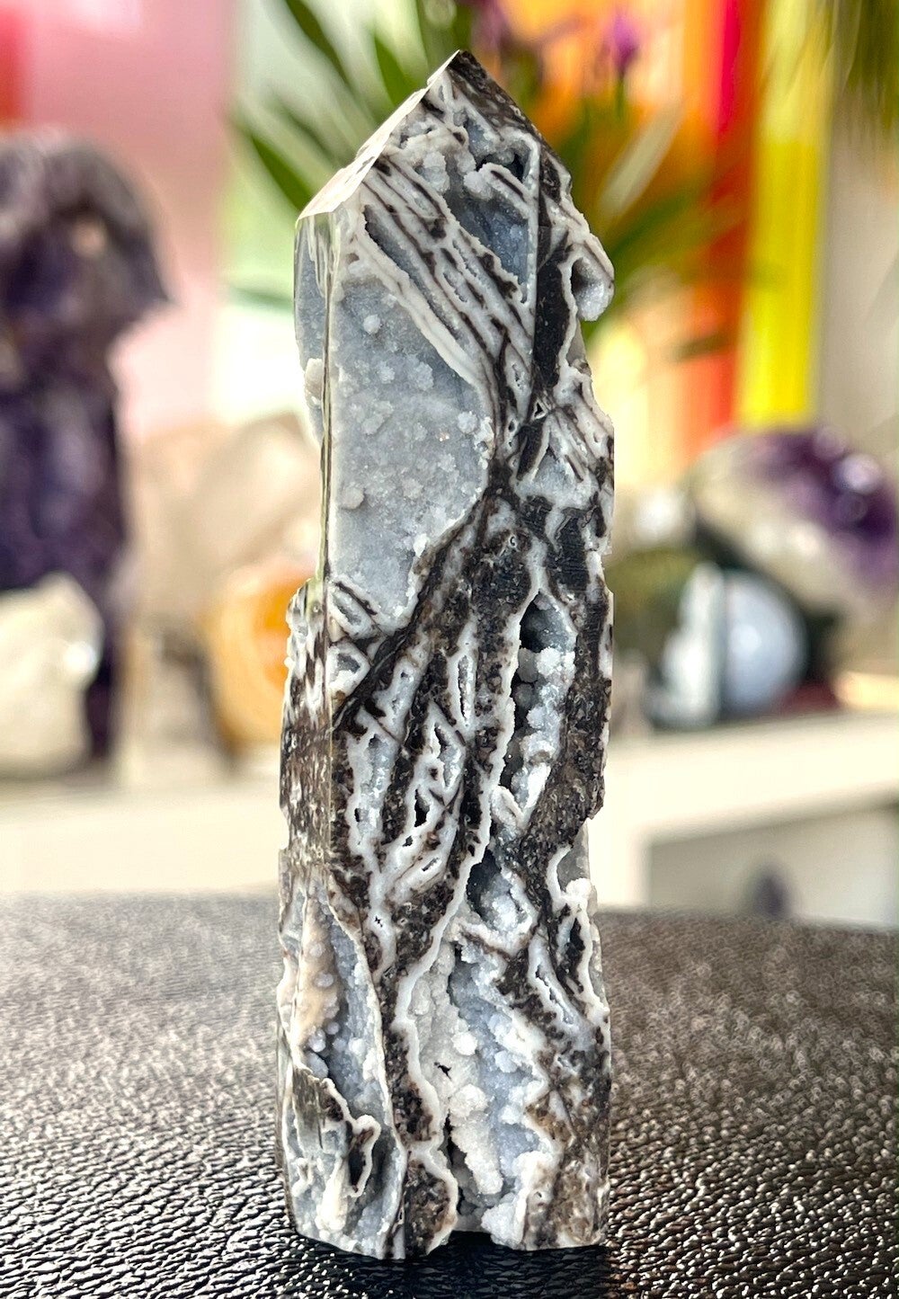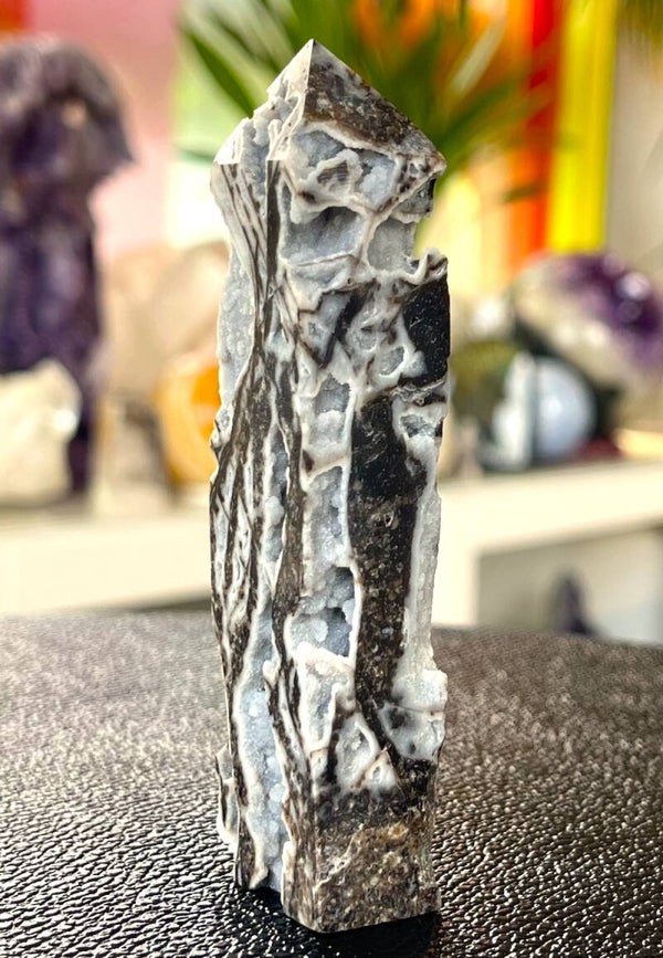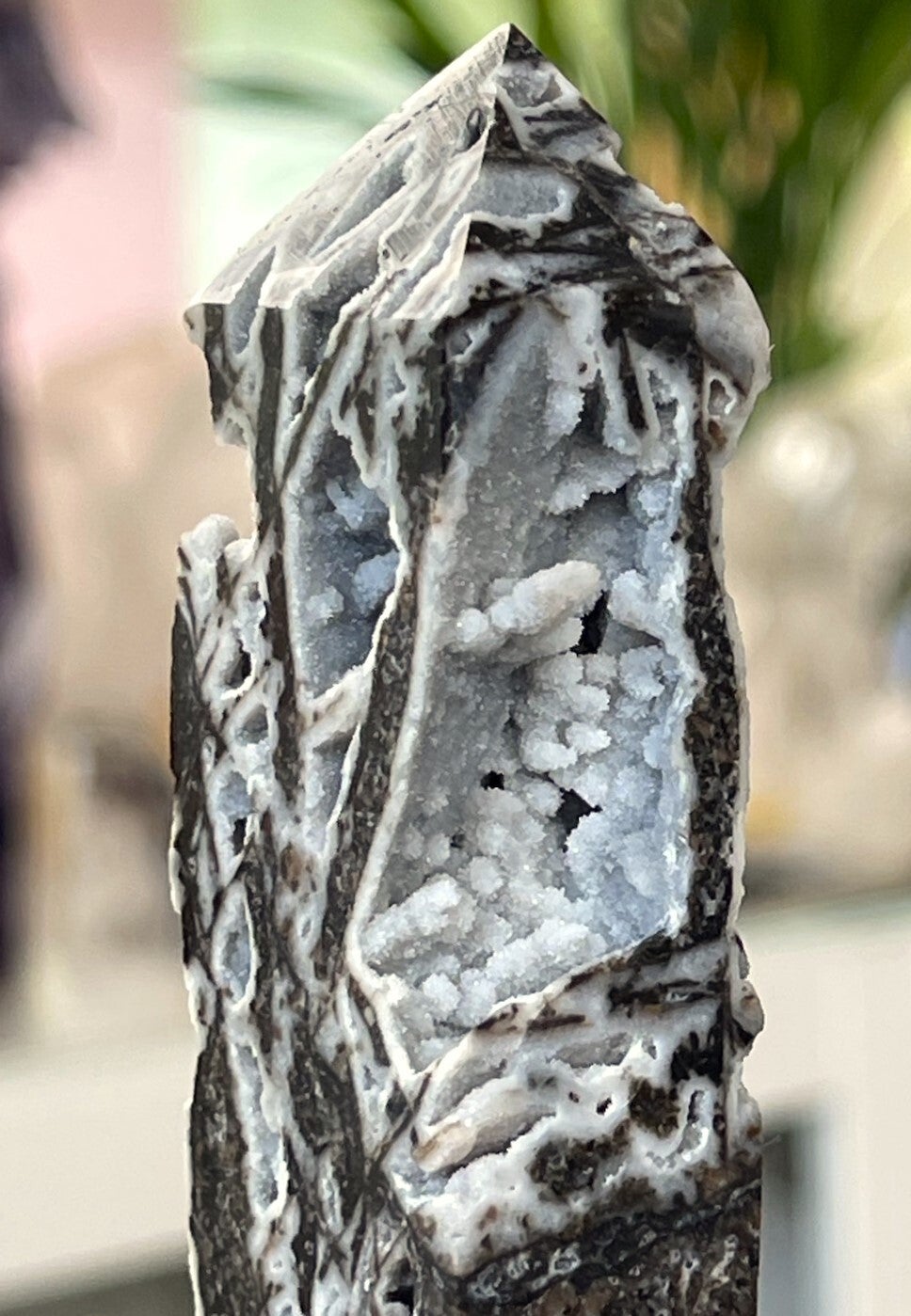 Prachtige, heel aparte Chalcedoon punt met open gekristalliseerde delen, uit Brazilië, gepolijst 4 vlakken
