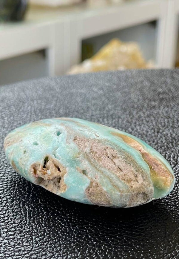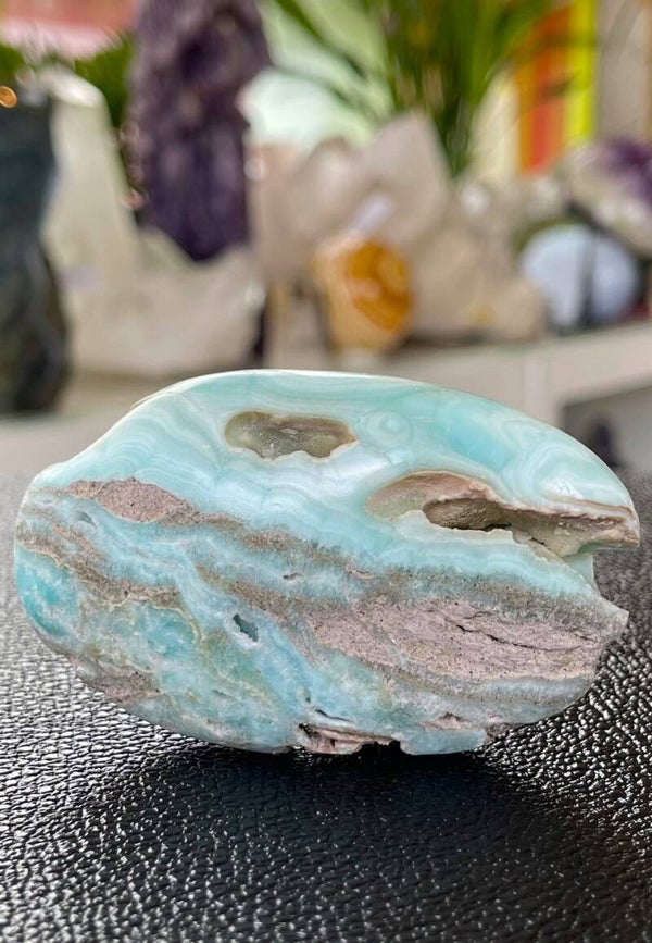 Caraibische blauwe Calciet werkt kalmerend, inzichtgevend en stimuleert je intuïtie en spirituele groei. Het maakt het makkelijker met de stroom mee te drijven en overbodige bagage los te laten. Het brengt je in een hogere bewustzijnstoestand en helpt je om je hoofd leeg te maken en je nulpunt te vinden.