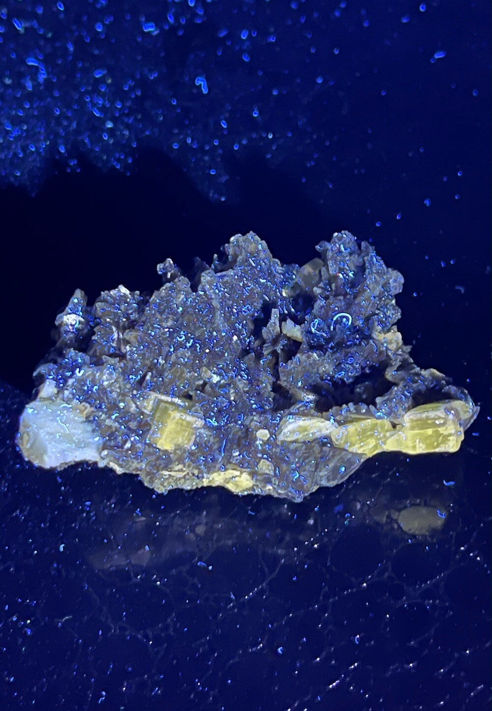 Zeldzaam, fluorescerend, kleurt geel onder UV licht (Fluorapatiet)