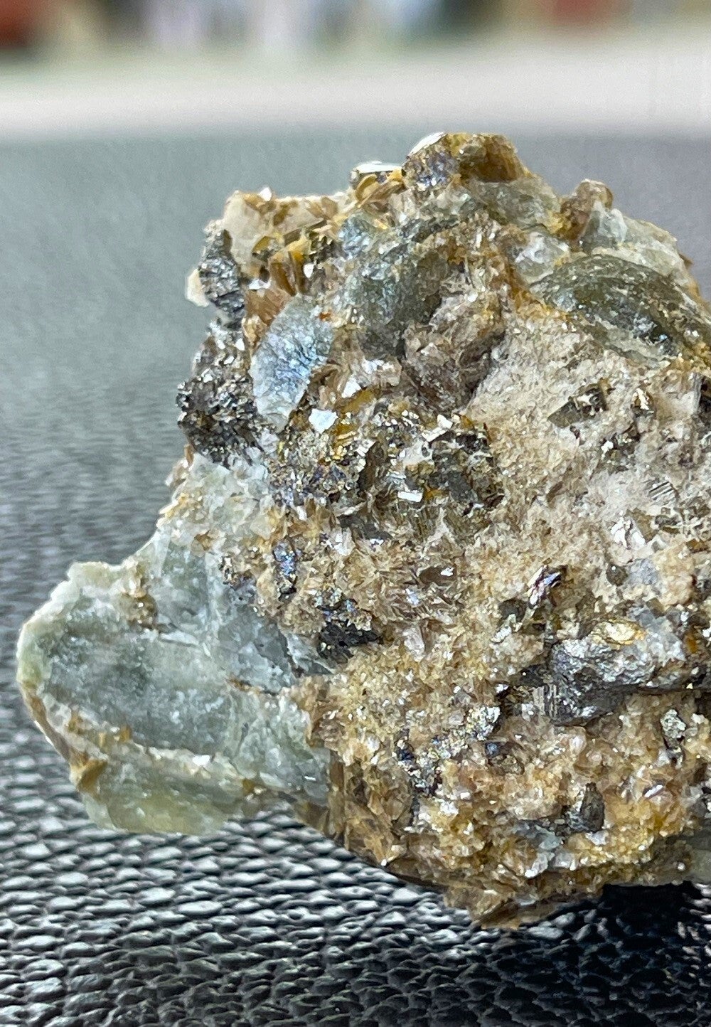 Ruw stukje groene Apatiet met Sideriet, Pyriet en Muscoviet uit Panasqueira Mines, Covilhã, Castelo Branco, Portugal, klein