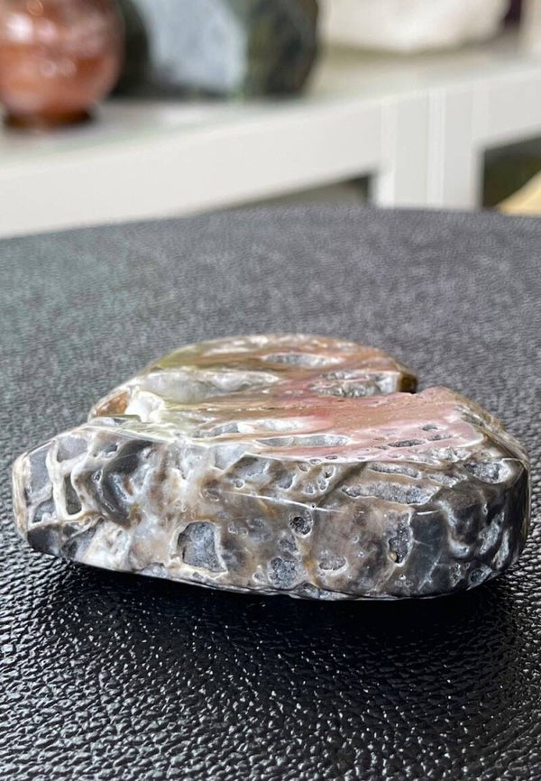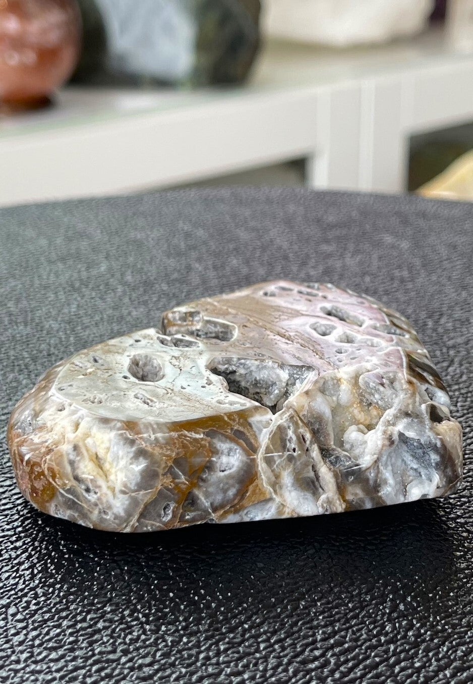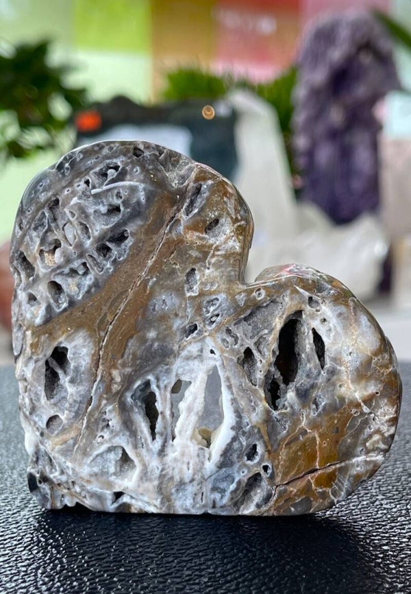 Chalcedoon hartje met gekristalliseerde open stukjes, een prachtig hart, medium tot groot