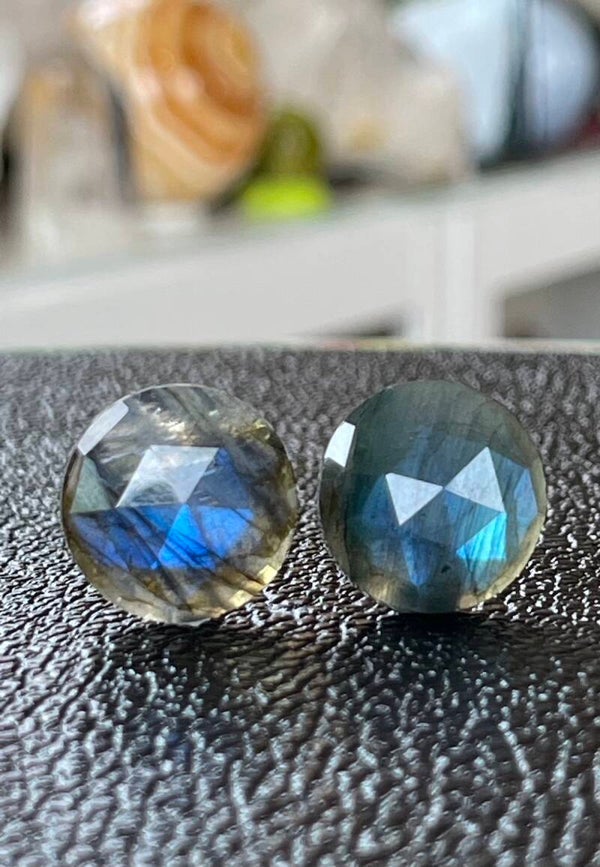 Labradoriet edelstenen checker facet geslepen per paar met vlakke achterkant rond, set van 2, medium