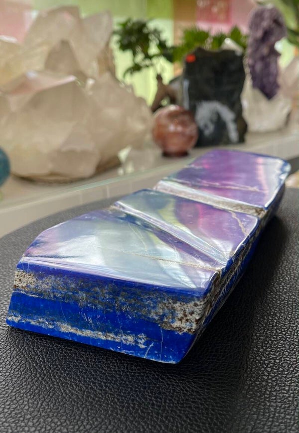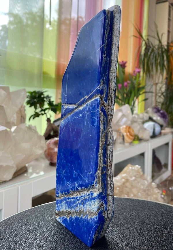 Stuk Lapis Lazuli met Pyriet, gepolijst, heel groot plat stuk, kan staan, mooie kwaliteit