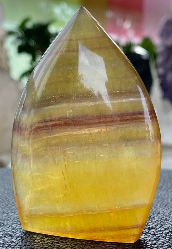 Prachtige gele Fluoriet free form sculptuur, gepolijst, kan staan, medium