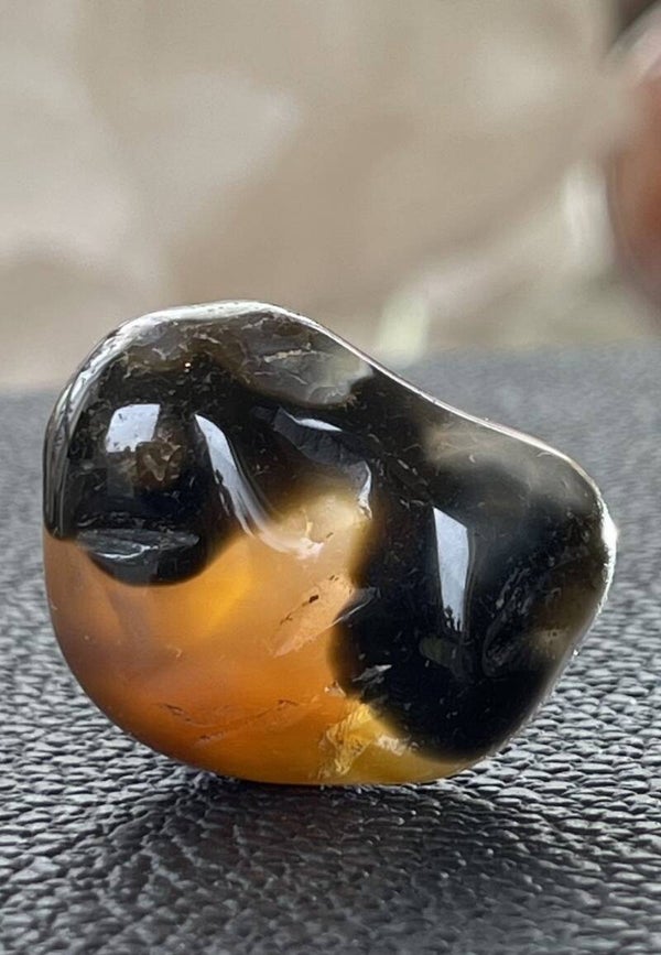 Agaat getrommeld, tegen het licht gehouden een deels transparante steen