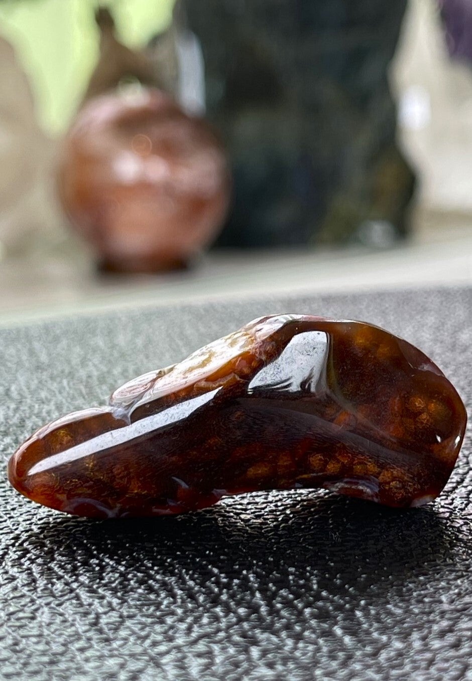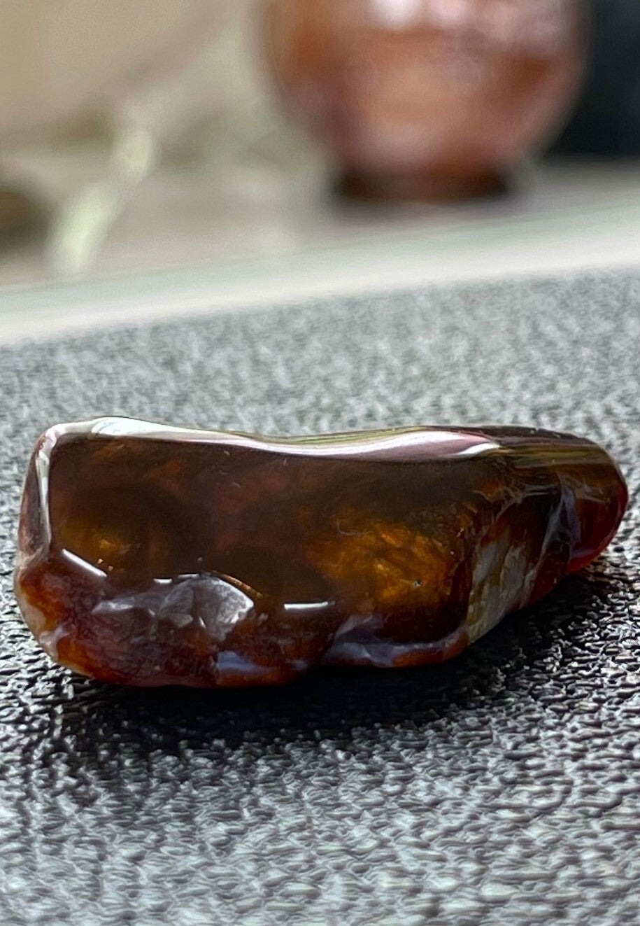 Mooi gepolijst stukje Vuuragaat uit Mexico, aan één zijde vlak, klein tot medium