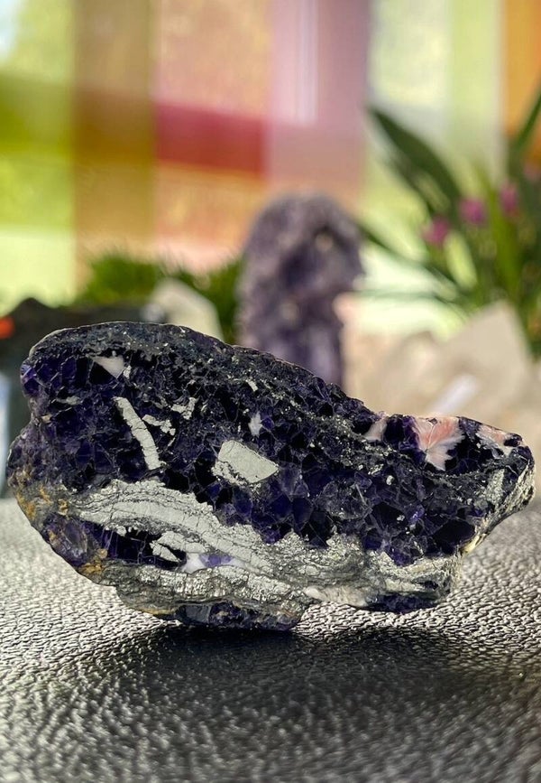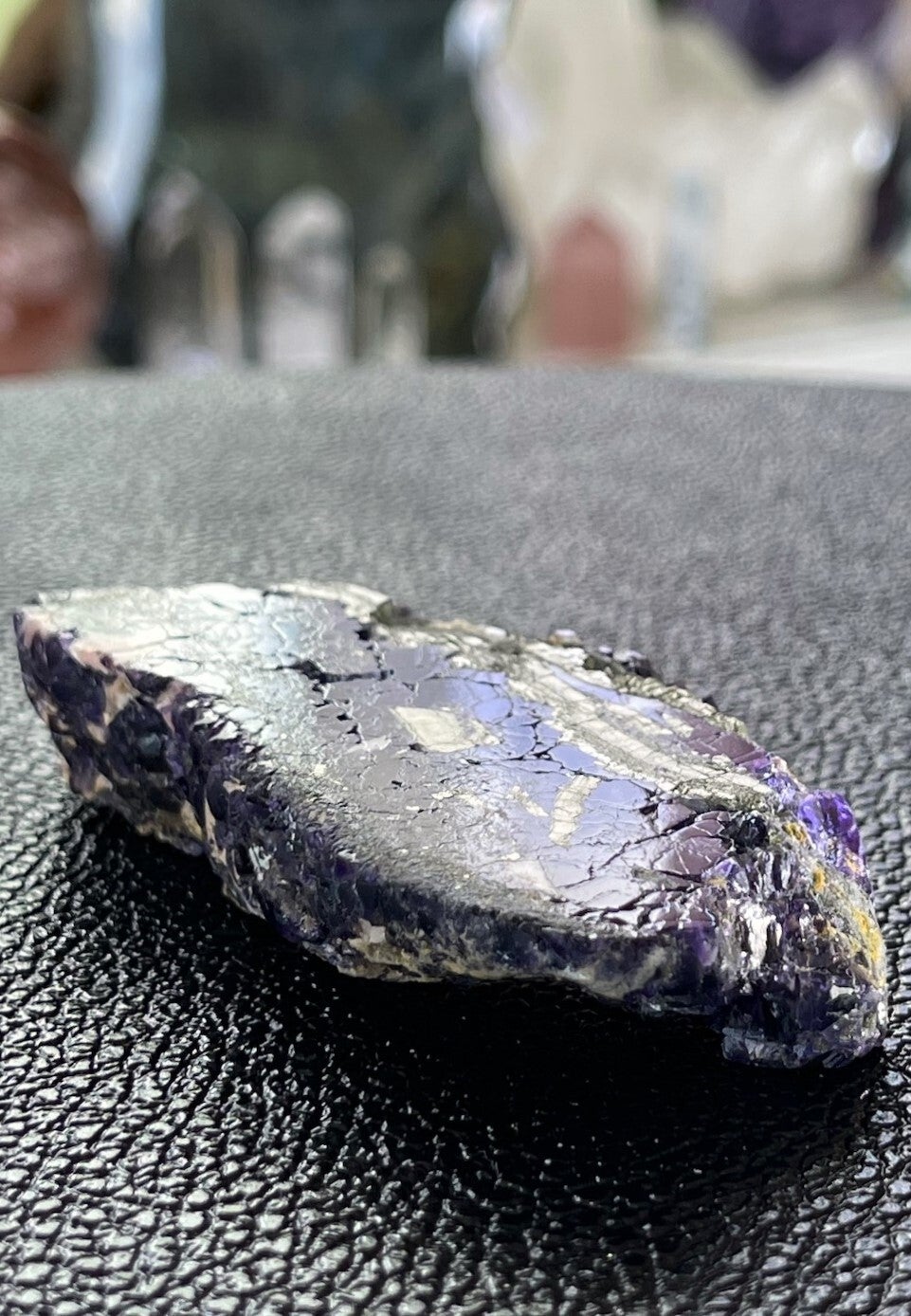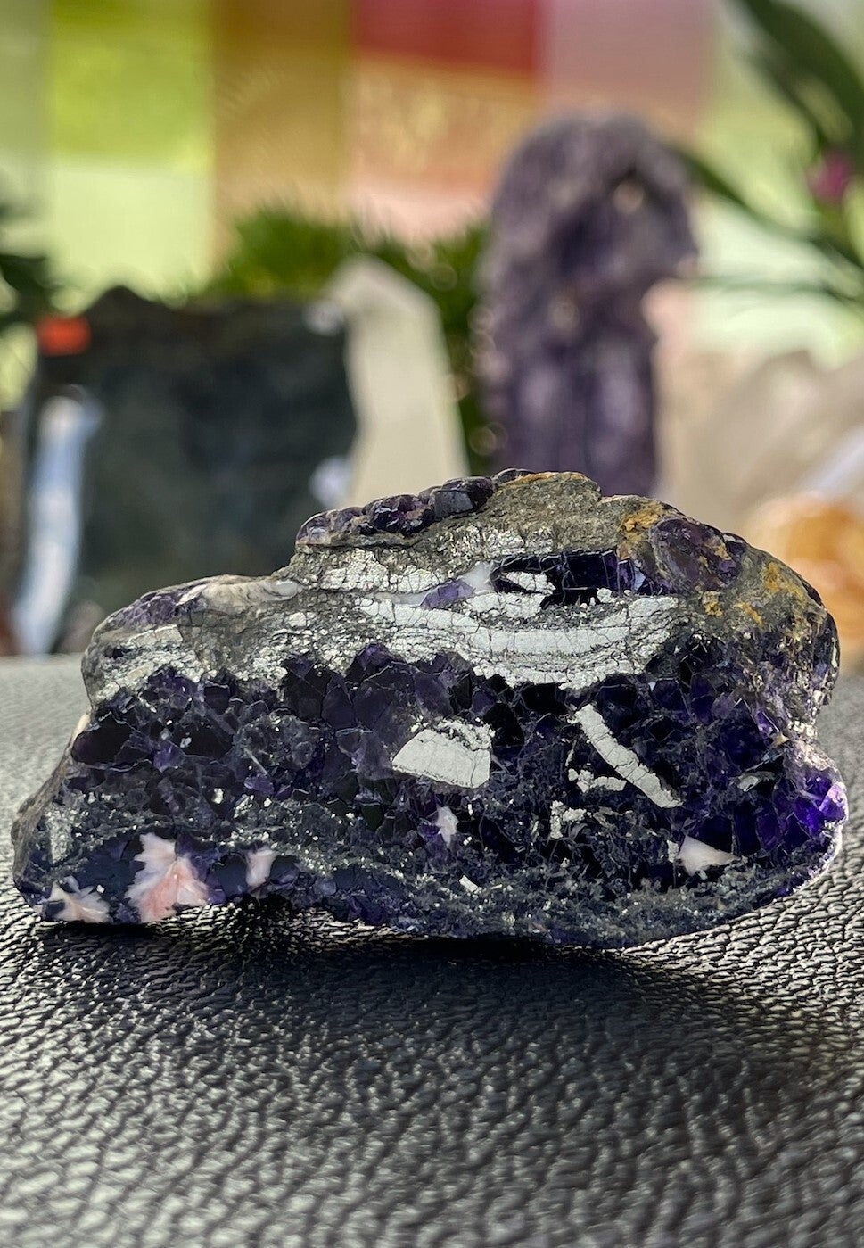 Mooi plat stuk paarse Fluoriet, Pyriet en Bariet uit La Collada Asturias Spanje, aan één zijde gepolijst, heel bijzonder stuk, klein tot medium