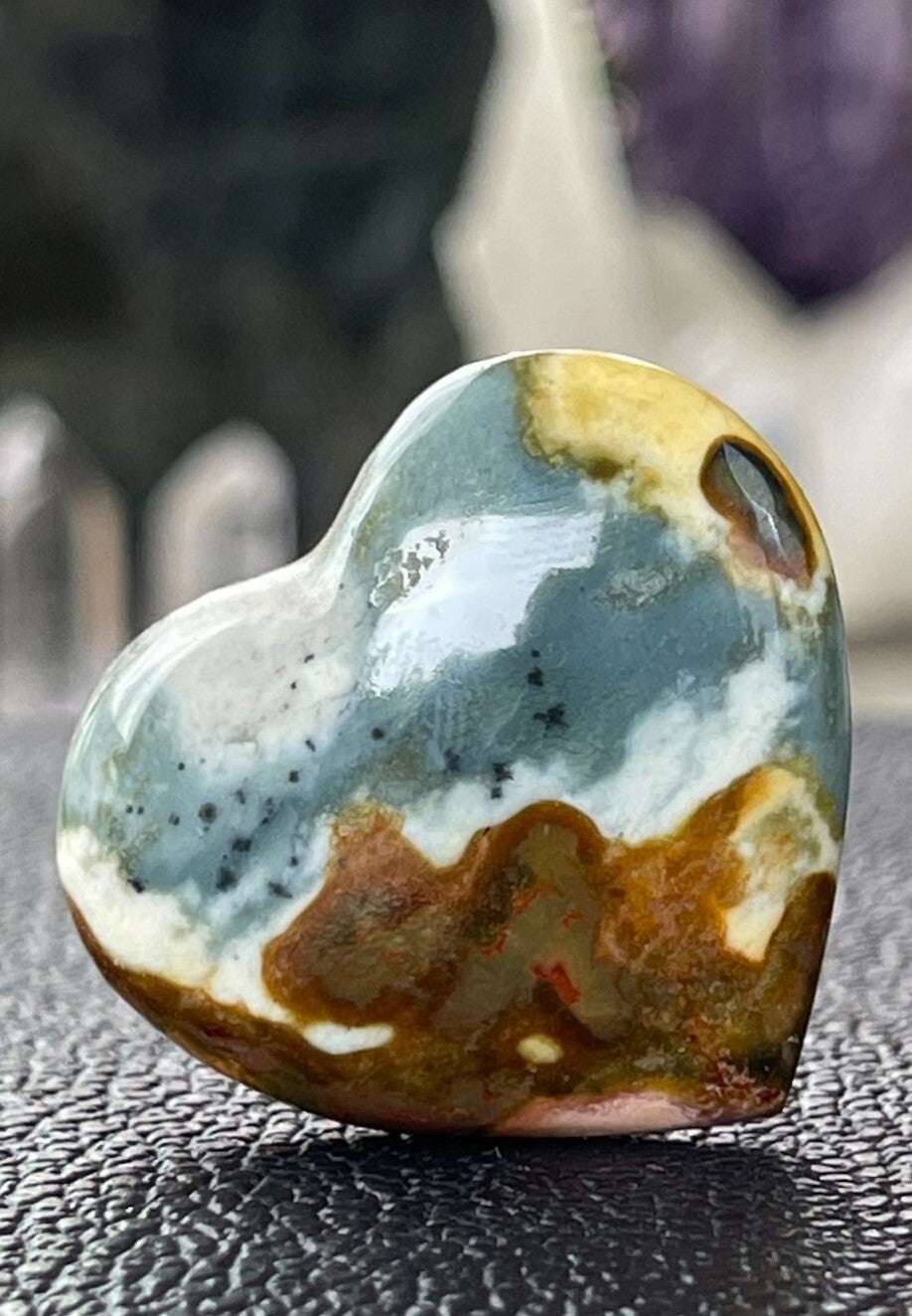 Polychroom Jaspis heeft de algemene eigenschappen van Jaspis en helpt je verder als je door de bomen het bos niet meer ziet. Door de vele problemen ziet men niet meer waar het begin is. Bij chaos in aardse zaken, als men van de hak op de tak springt.