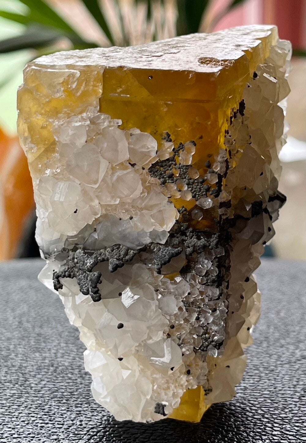 Prachtig ruw stukje gele Fluoriet met Kwarts en Pyriet uit El Hammam Marokko, kan staan, medium