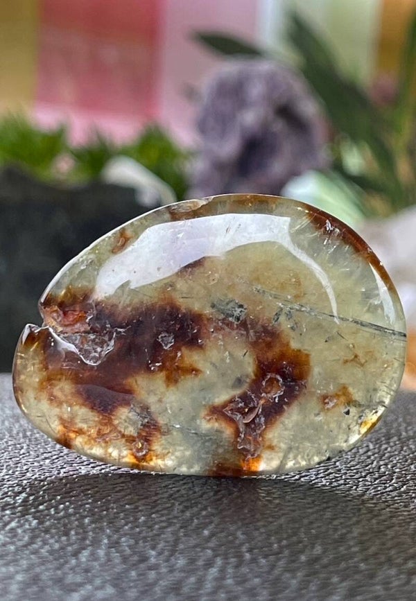 Mooie Prehniet met Toermalijn en Hematiet platte knuffelsteen of zaksteen, groot