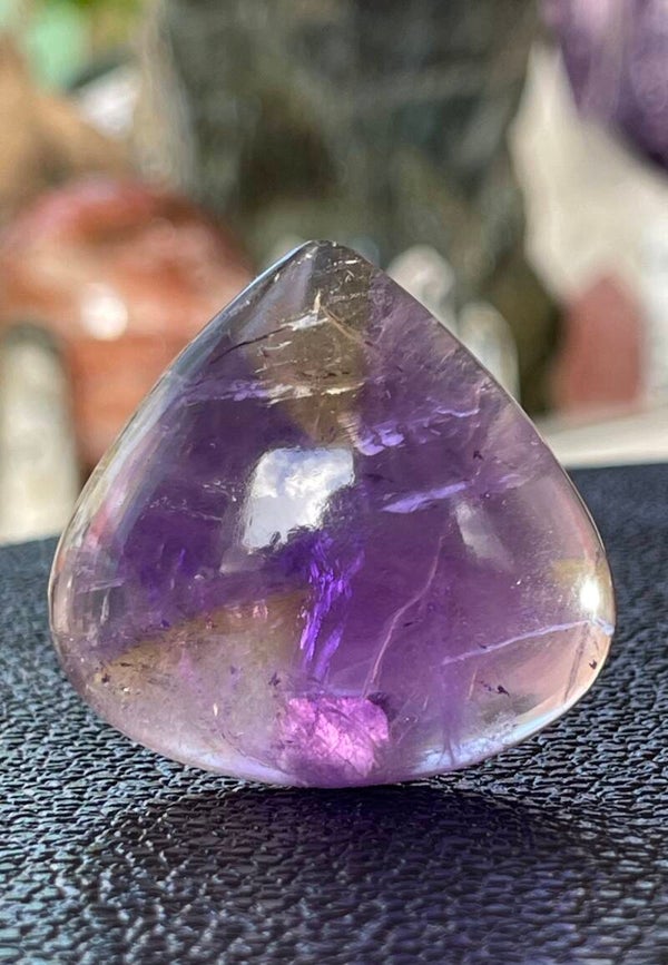 Ametrien bestaat uit een combinatie van Amethist en Citrien en verenigt de eigenschappen van deze twee stenen in zich. De opbeurende en verwarmende energie van Citrien en de beschermende en zuiverende werking van Amethist. Geeft innerlijke rust en gelatenheid.