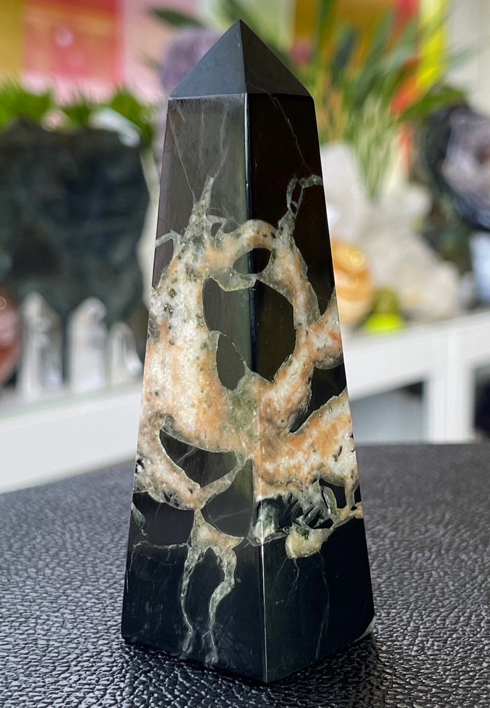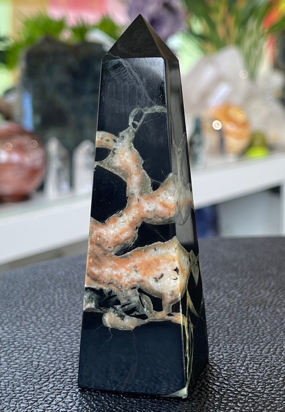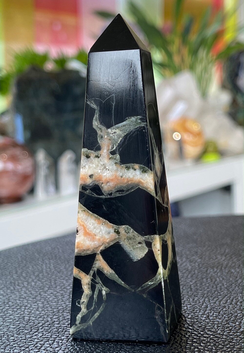 Zwarte Septarie met Pyriet uit Peru, punt of obelisk met 4 vlakken gepolijst, medium