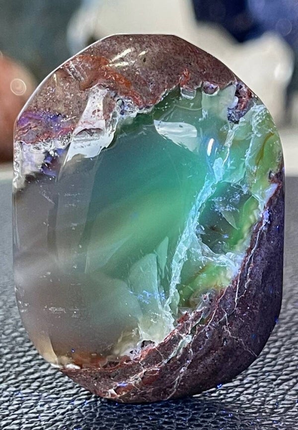 Vulkaanagaat is een recent gevonden fluorescerende steen die onder UV licht deels groen kleurt.